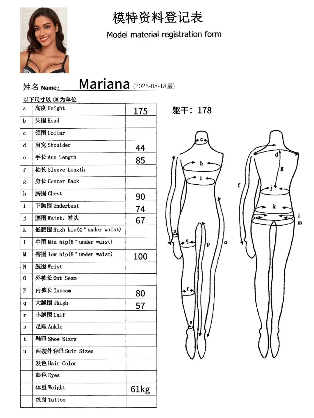身高:176cm,三围:90-66-97 ,鞋码:39