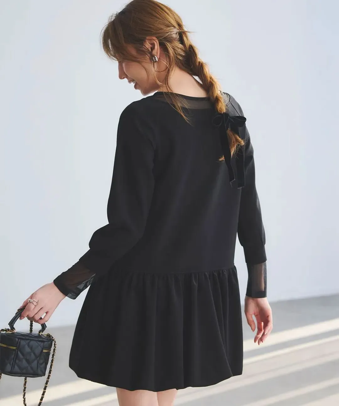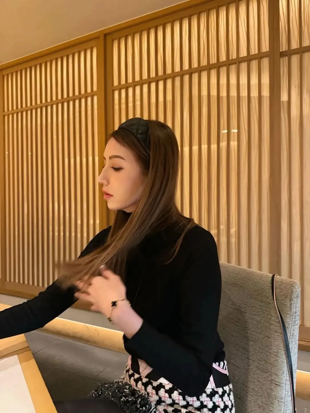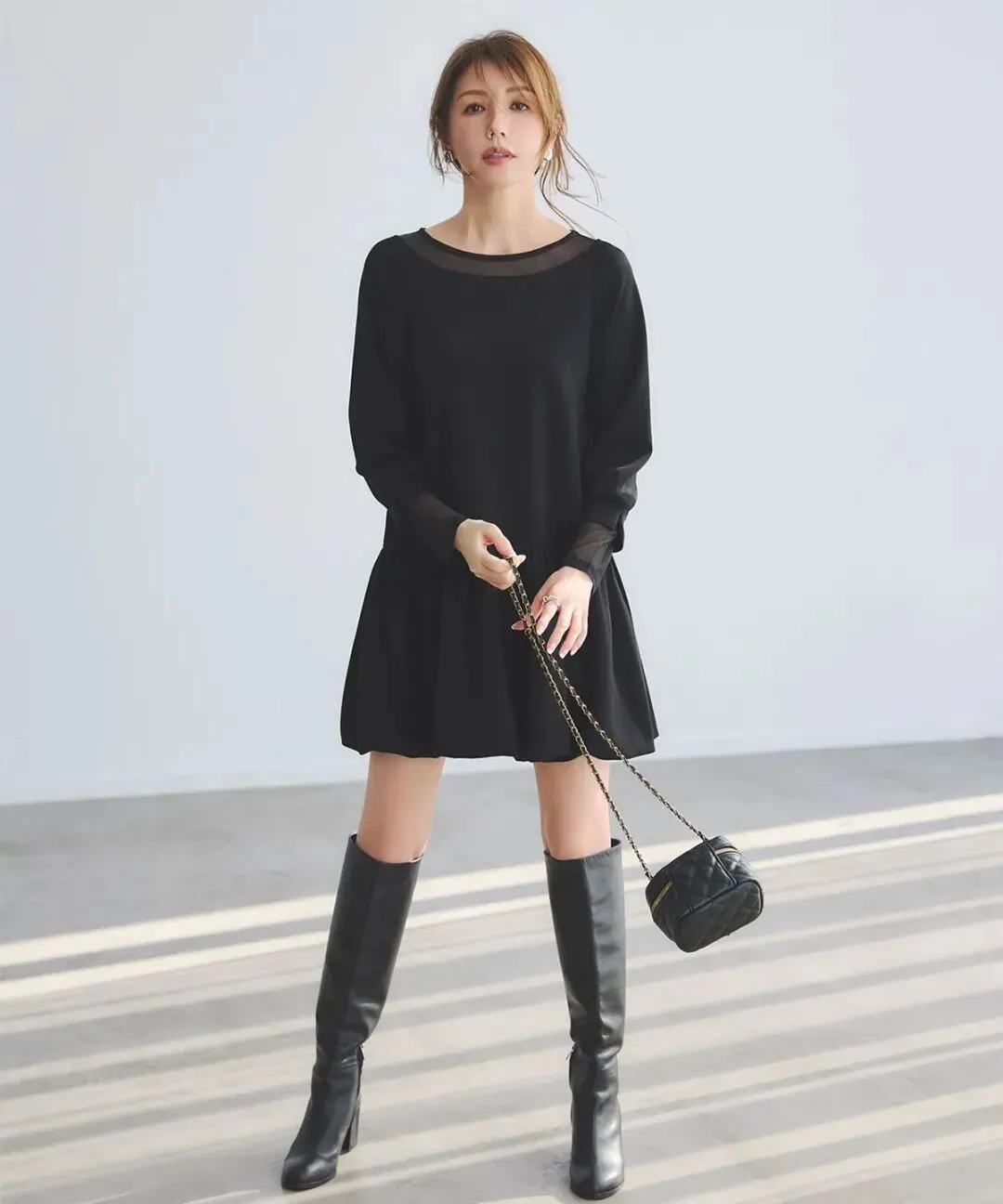 黑色短裙+黑色长靴的搭配组合,再加个精致小皮包,看起来就有点小钱,而且还能凸显腿部线条、拉长身形比例。麻花辫+蝴蝶结发饰,传递些许甜味。