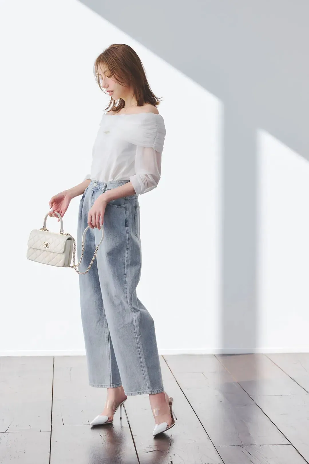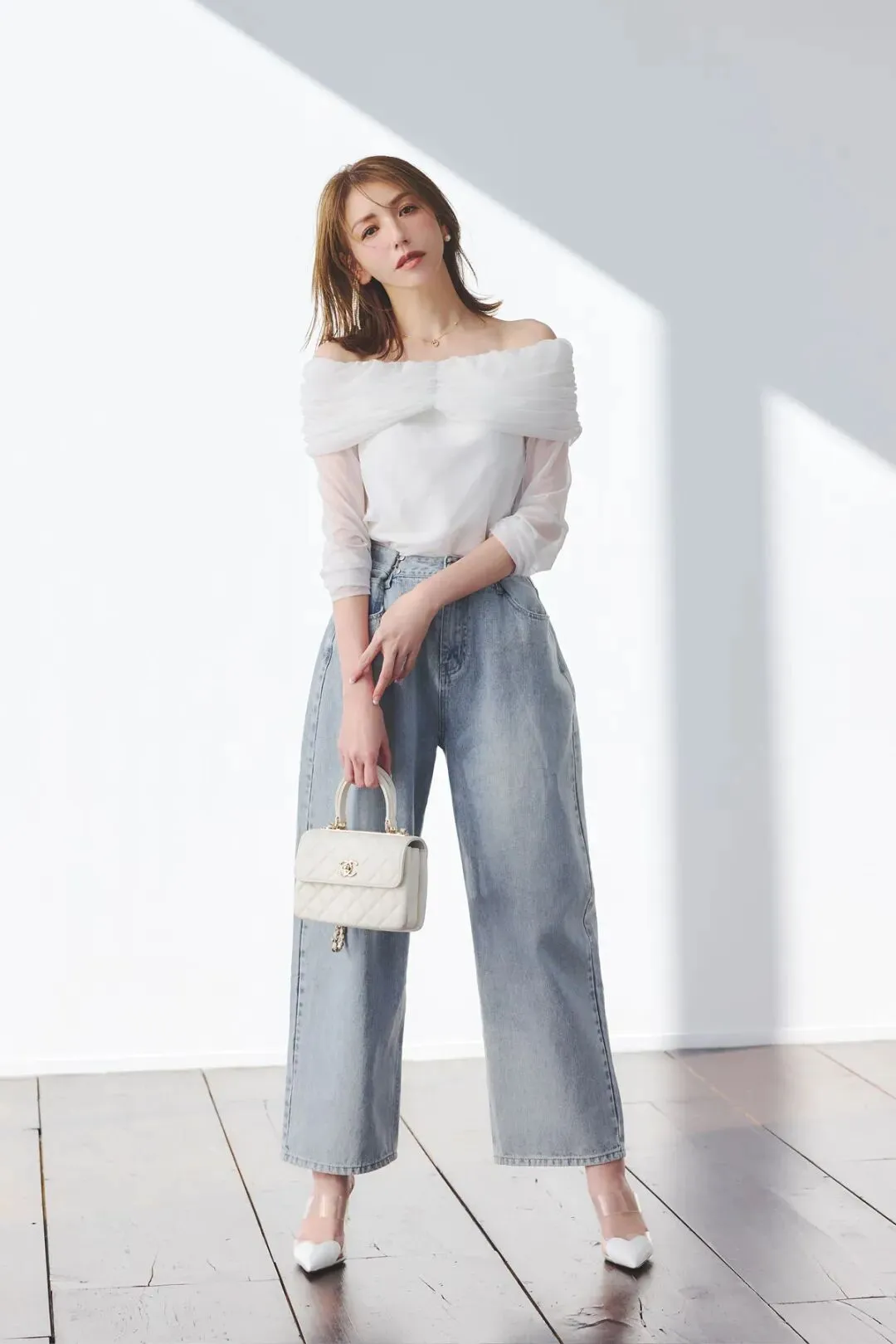 轻盈的白色网纱拼接上衣,增强造型的呼吸感,与春日的氛围相配。搭配九分牛仔裤+尖头高跟鞋,轻松拉长身形。