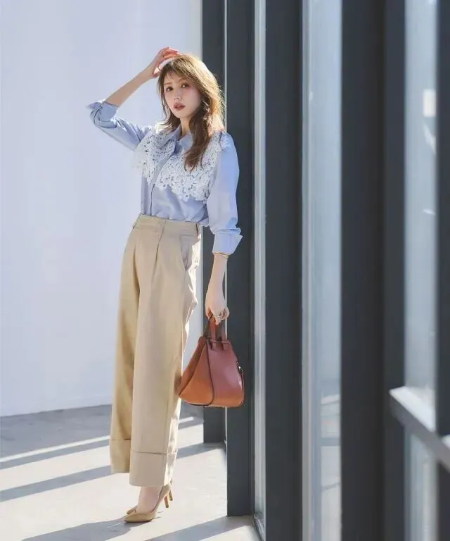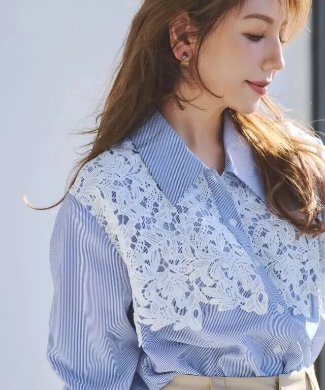 竖条纹的蓝色衬衫是职场风的经典单品,竖条纹设计在视觉上有纵向延伸效果,可以修饰身形。融入蕾丝的设计,让司空见惯的单品也变得富有新意。