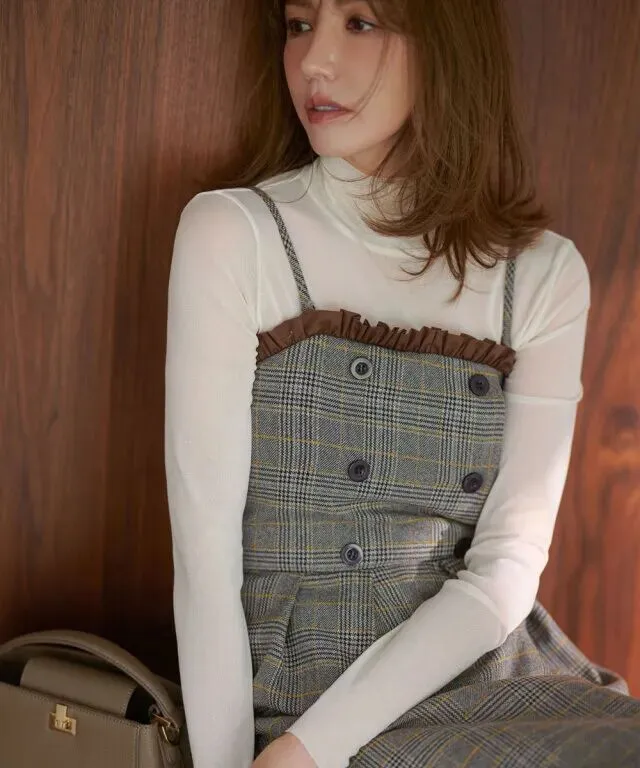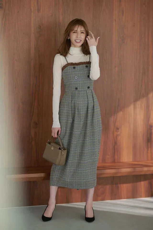 格纹吊带裙有着一定程度上的视觉冲击,胸前的荷叶边褶皱设计,为成熟风格增添些许甜美少女味道。