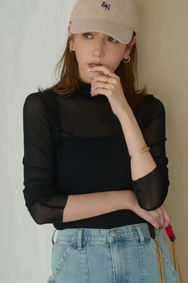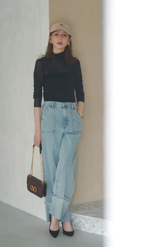 裤腿翻边的牛仔阔腿裤看起来率先利落,搭配一顶字母棒球帽颇有街头不羁的风格。隐隐约约露肤的黑色网纱上衣,不乏神秘妩媚感。