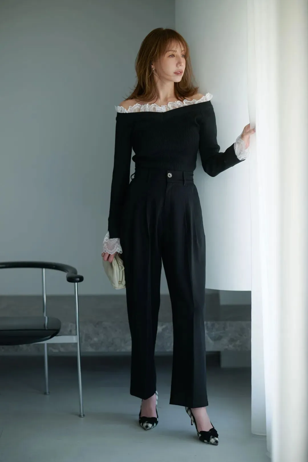 一字领的设计+蕾丝边的组合,强势地把目光吸引到脖颈处,尽情展现女人味。一身深色系的装扮,简约高级。