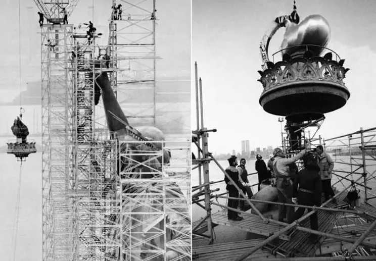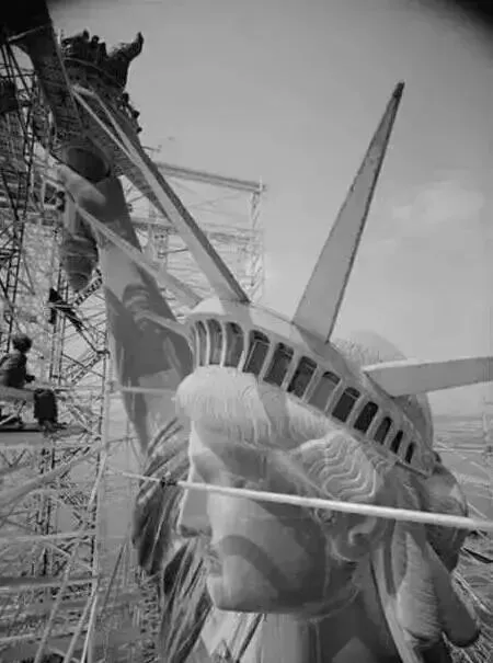 同年6月,法国“叶塞莱”号运载着210箱塑像主件抵达纽约港,受到美国船队和《世界报》租用的“埃蒙斯”号的热烈欢迎。随后,75名工人用了半年时间,用30万颗铆钉将雕像组装起来
