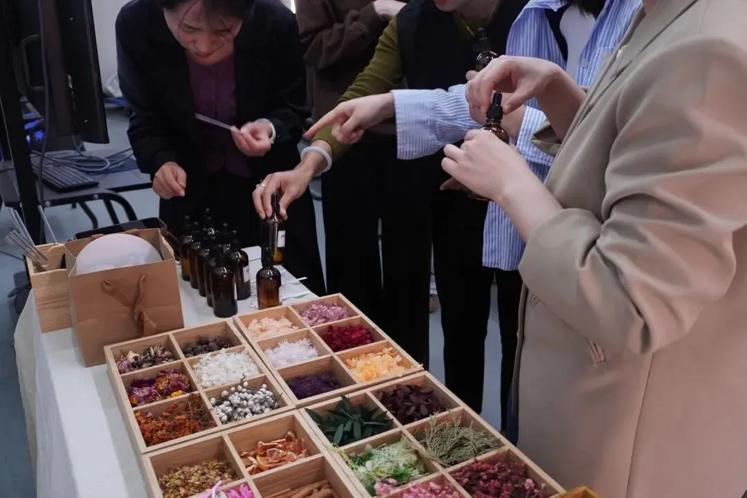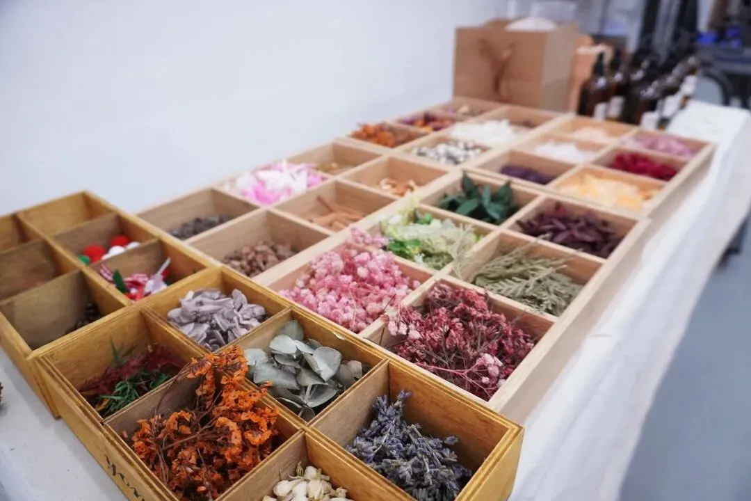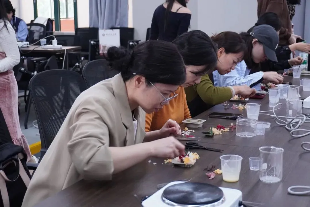 整个过程严谨而充满趣味:从精心挑选心仪的香型、确定整体香调,到细致地融化蜡基、精准控制温度,再到将混合好的香蜡注入精致的模具等待成型,最后用干花枝叶进行创意点缀。活动现场弥漫着舒缓的蜡材香气与芬芳,氛围温馨而专注。