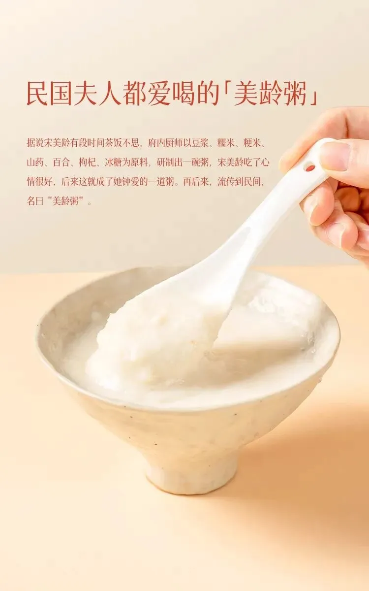 说到养脾胃,有一道食方特别适合现在——美龄粥,美龄粥的发明人就是民国大美人宋美龄,当年宋美龄先生事务繁忙,心绪操劳,常常茶饭不思,胃口不佳。府里的大厨看在眼里,急在心里,便用心思量,以豆浆代替清水,搭配山药、糯米等温和食材,慢火细熬成一碗清润的甜粥。