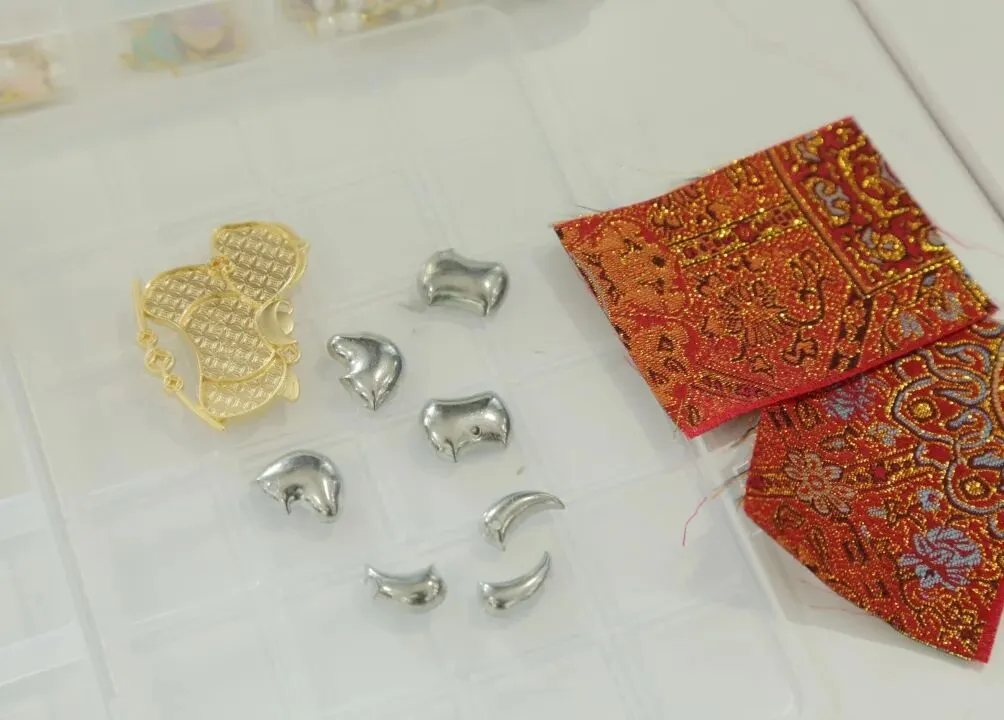 老师们围坐一桌,手持精致的宋锦布料、挂绳与配件,认真聆听、细心操作,穿绳、拼接、固定、装饰,每一个步骤都饱含巧思。