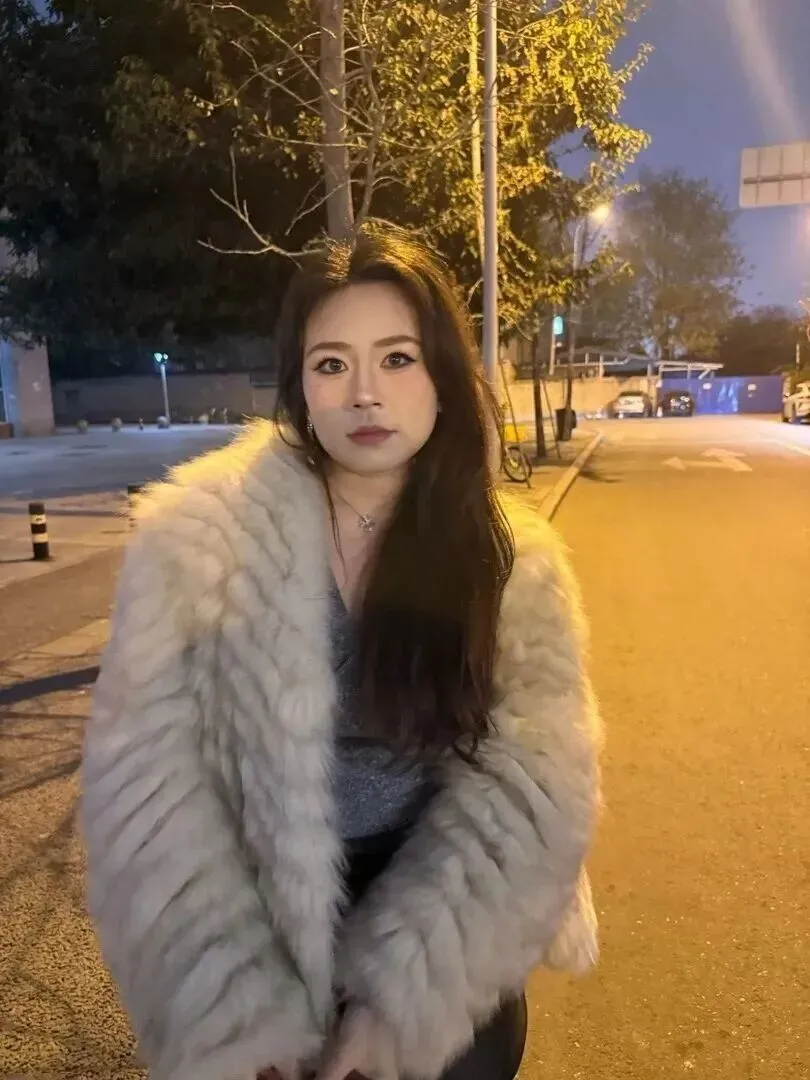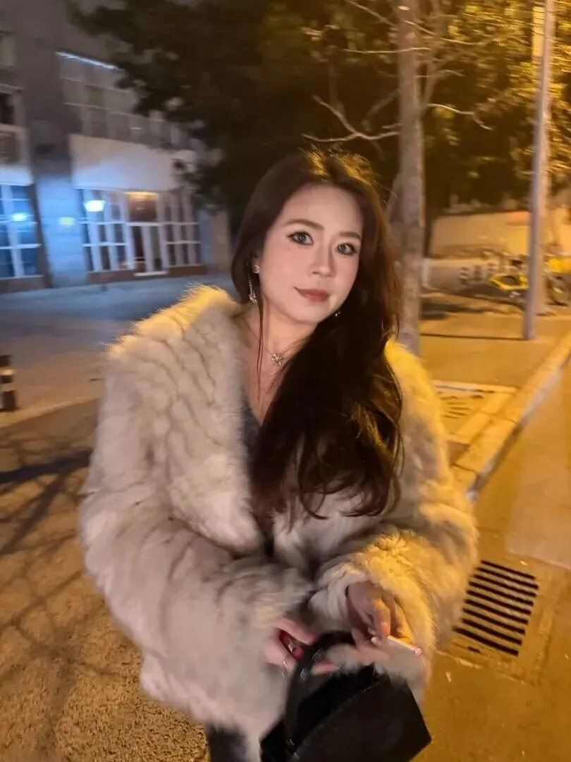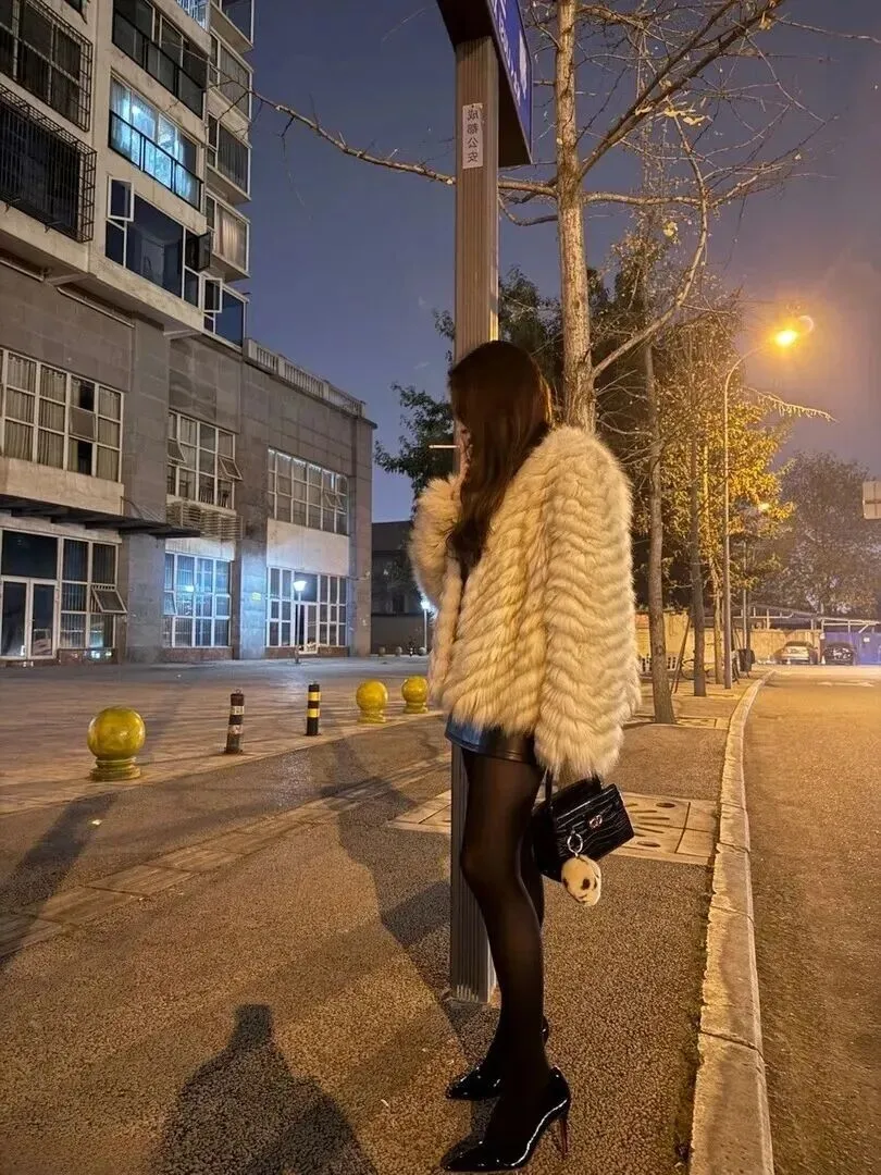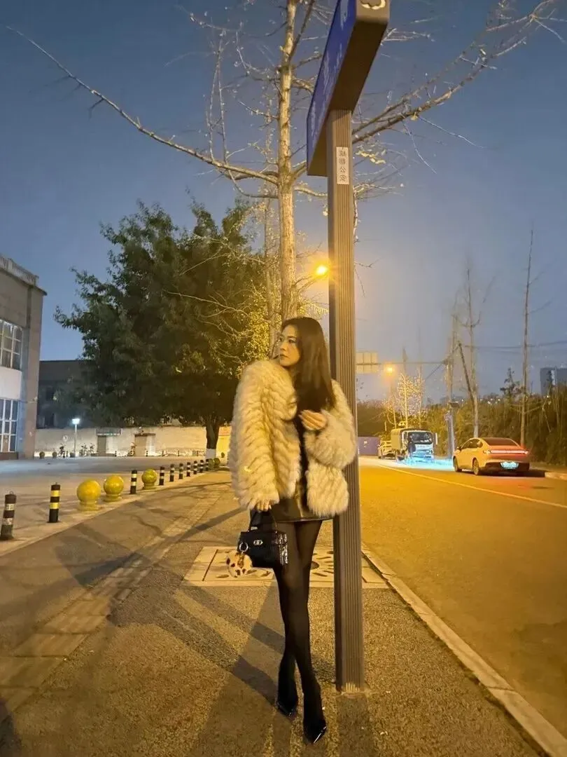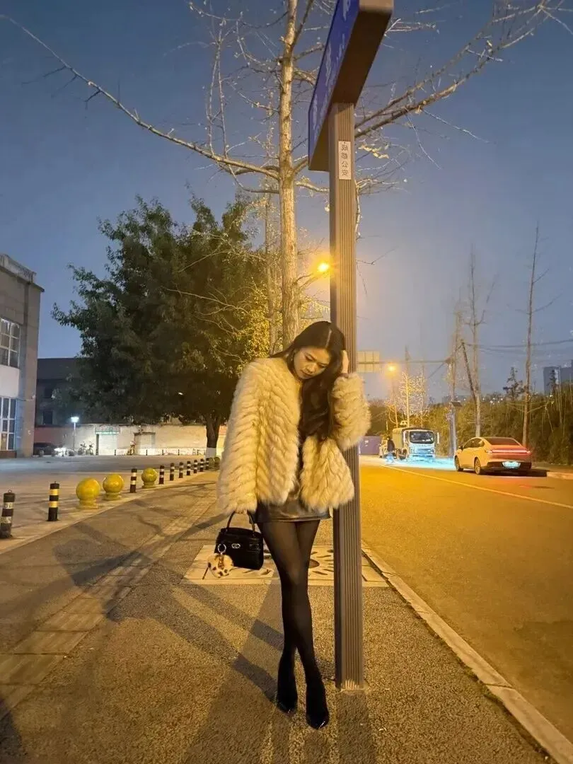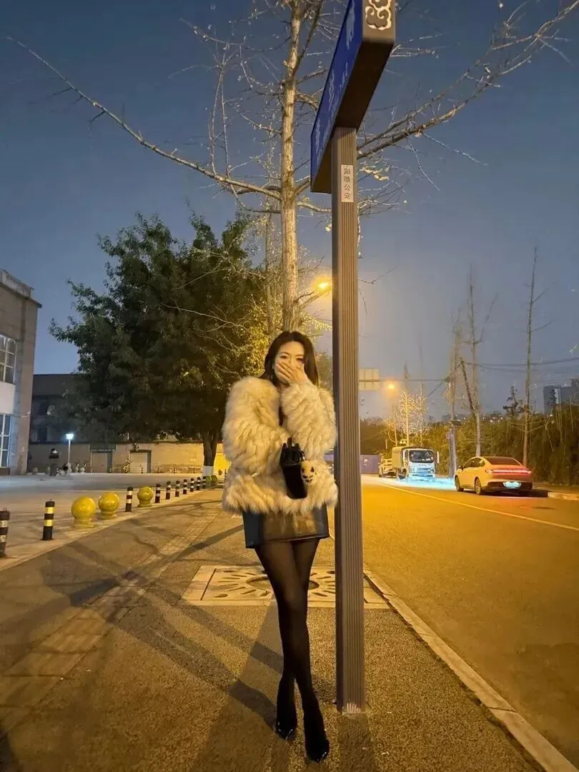 她就站在公交站牌旁,穿着更显出一种有态度的打扮。米白色毛茸茸的外套加上黑皮裙子,很保暖、干净利落。黑色丝袜加尖头高跟鞋把她的腿条条索索完全暴露。包上有一个小小的毛绒挂饰,十分可爱。背景是暖黄色的街灯,带有清冷感,但是她的穿着却很好地融入了这种氛围中。冬天在室外等着车辆,穿得既不单薄又不冷,非常吸引人。