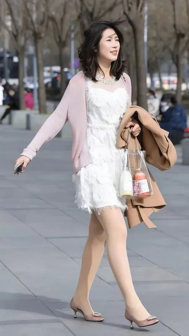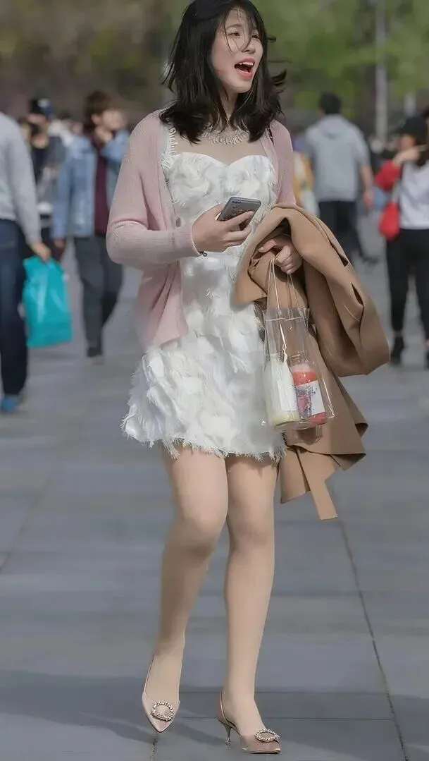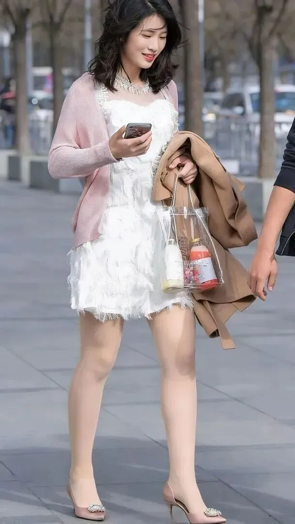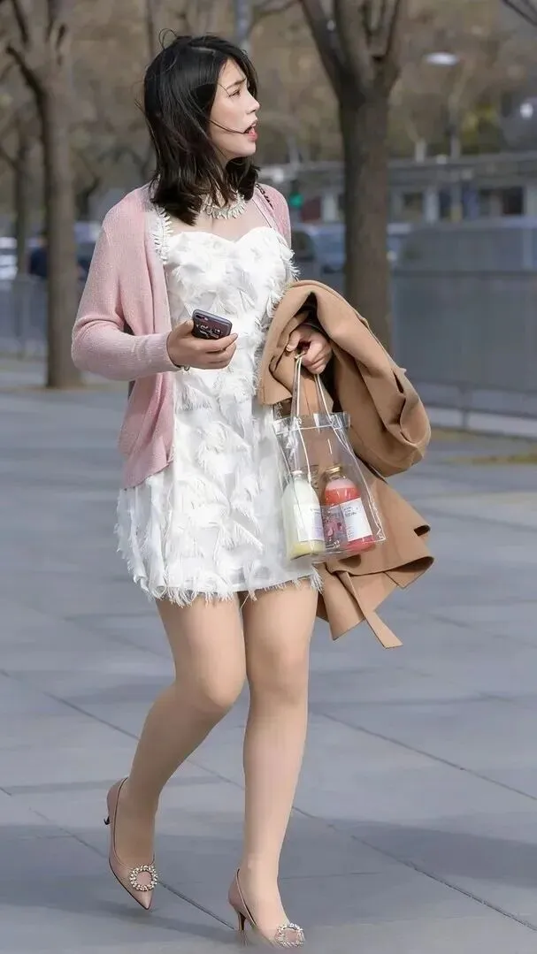 首先看看她选的衣服是什么样的白色羽毛连衣裙。裙子上有长有圆有,羽翎轻飘,轻如烟,随身舞动,在春风的温柔里,在春色阑珊的芳华中,在花开花落的轮回里。搭配一件浅粉色的针织开衫,整个人就变得柔软起来,甜了起来,很有点女性的气息。简单又不失高级感,适合各种场合使用。