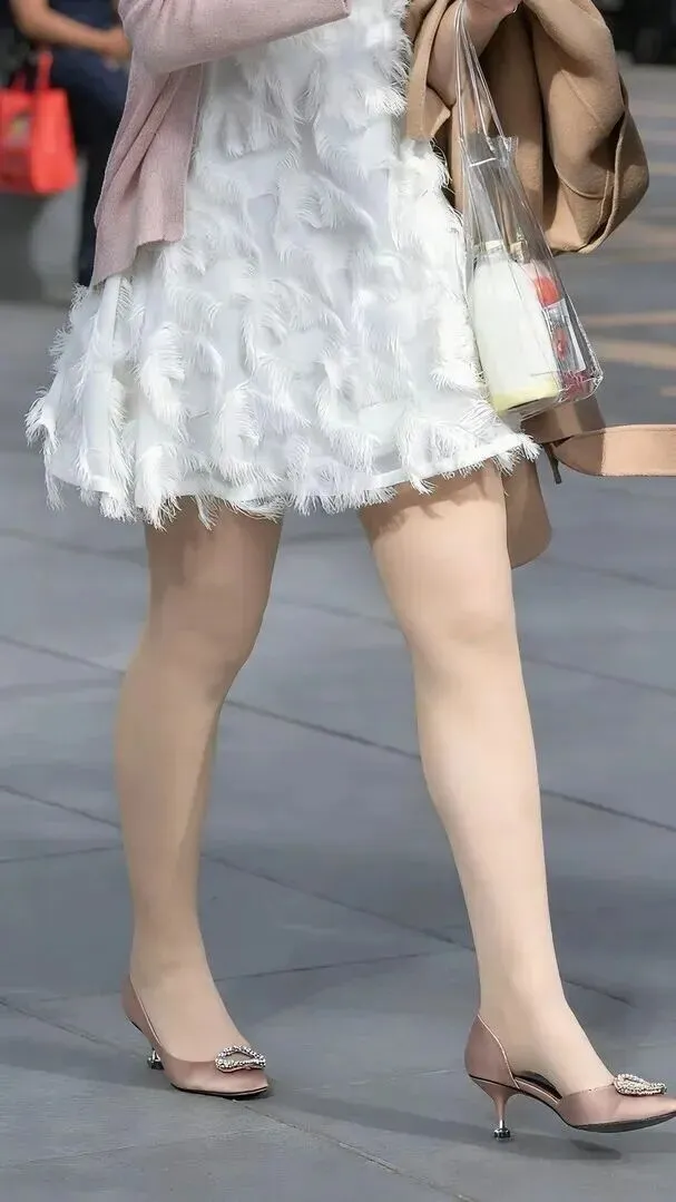 裙子的下摆采用羽毛流苏设计,不规则的造型随着风飘动,很活泼。穿薄薄的浅色丝袜使腿部线条更细长。高跟鞋是粉色裸色的,细跟设计拉长了腿型,看上去更加高挑。这种小心思很值得学习,简单的单品也能穿出大牌感。