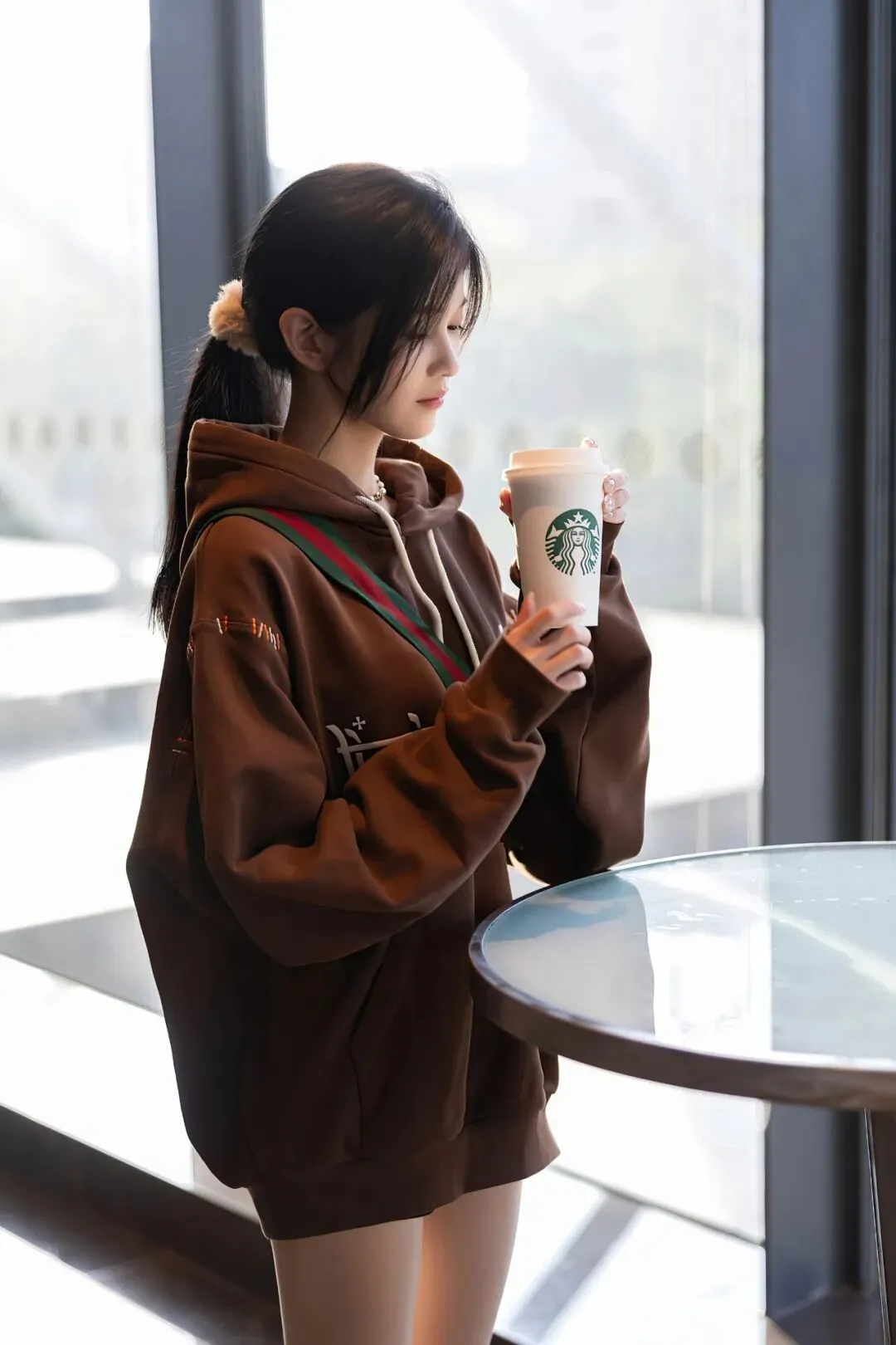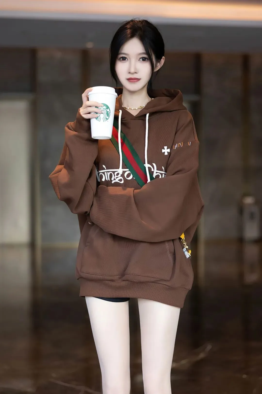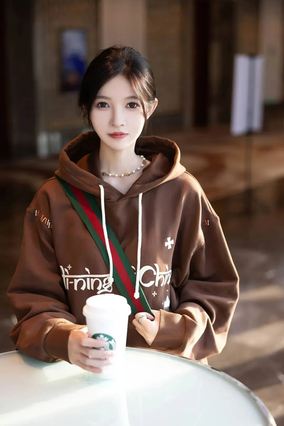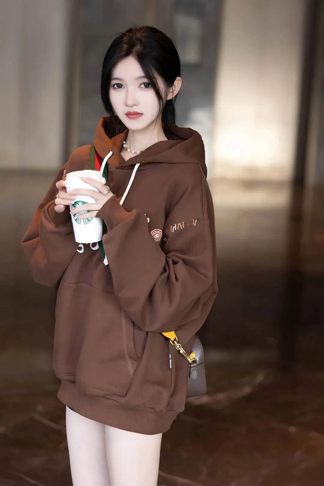 服装与造型的搭配,是这组照片氛围感的核心。咖啡色连帽卫衣是视觉灵魂,宽松的版型带着慵懒的休闲感,衣身的字母印花与彩色缝线装饰为基础款注入了细节趣味,既保留了舒适感,又凸显了时尚态度。下装的失踪穿法搭配原色丝袜,通透的质感与卫衣的厚重形成材质对比,既勾勒出修长的腿部线条,又在含蓄中透出一丝魅惑,完美平衡了休闲风的随性与女性的柔美。配饰上,珍珠项链与细带挎包的点缀,为整体造型增添了精致感,让日常穿搭更具层次。