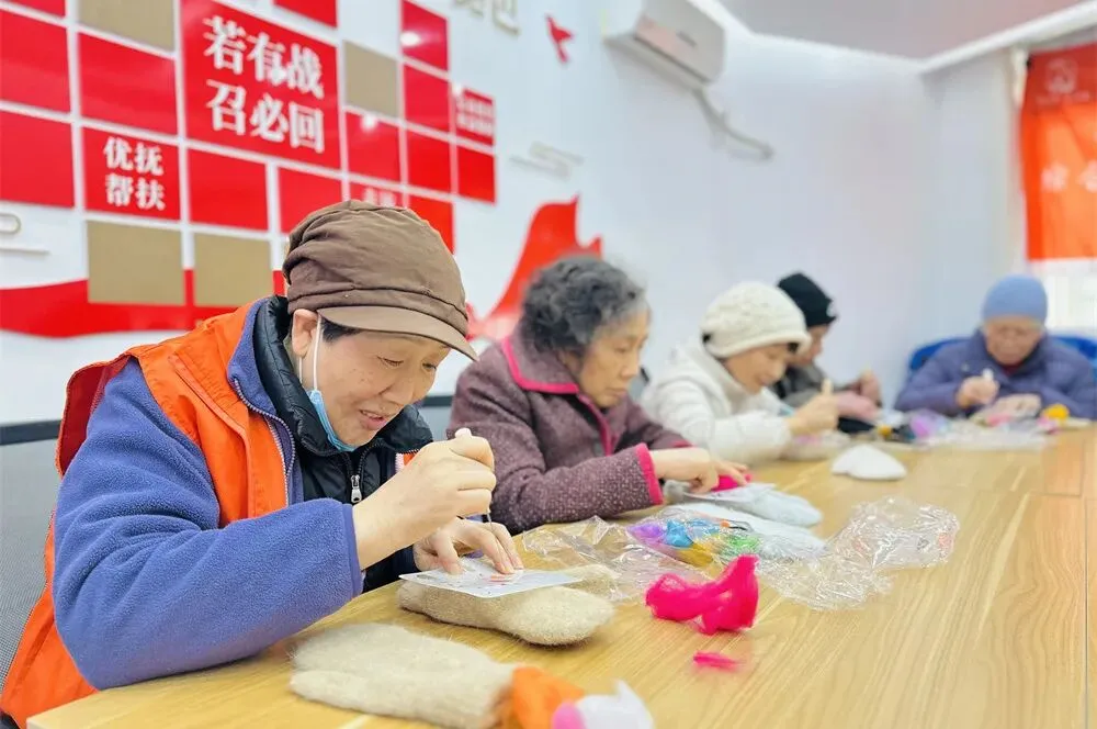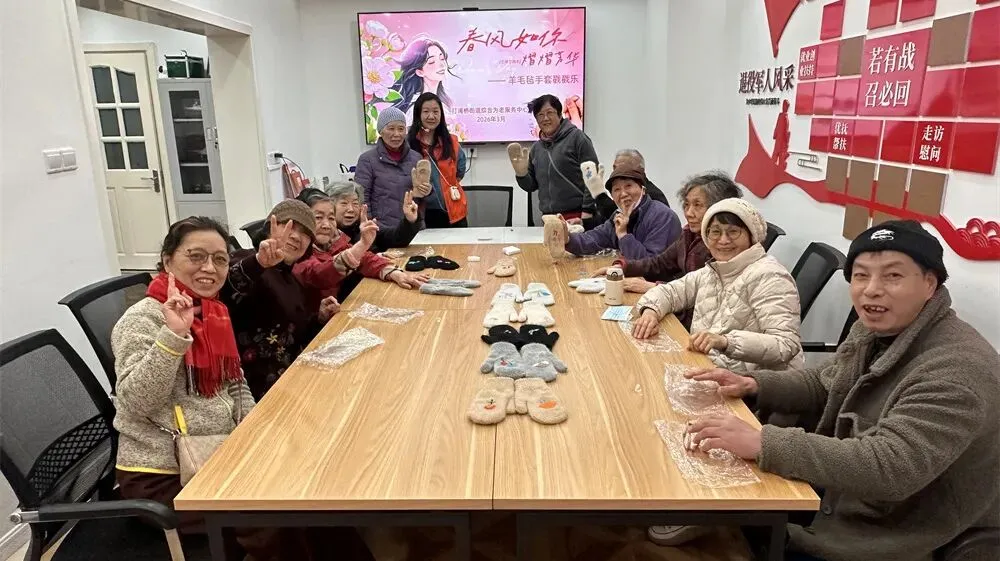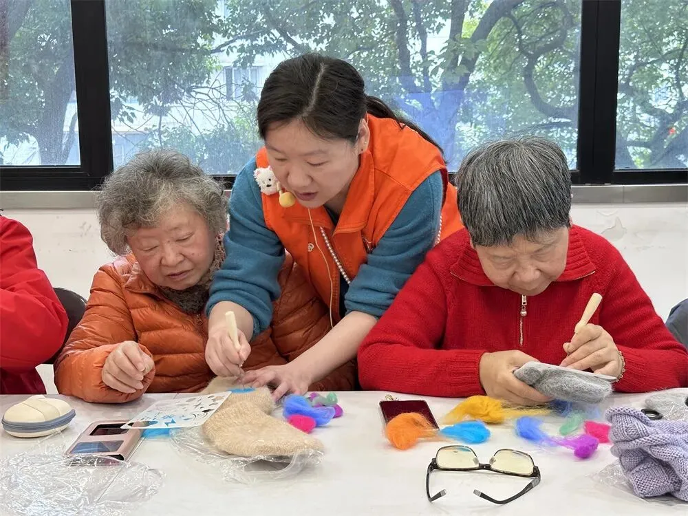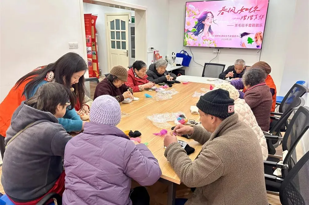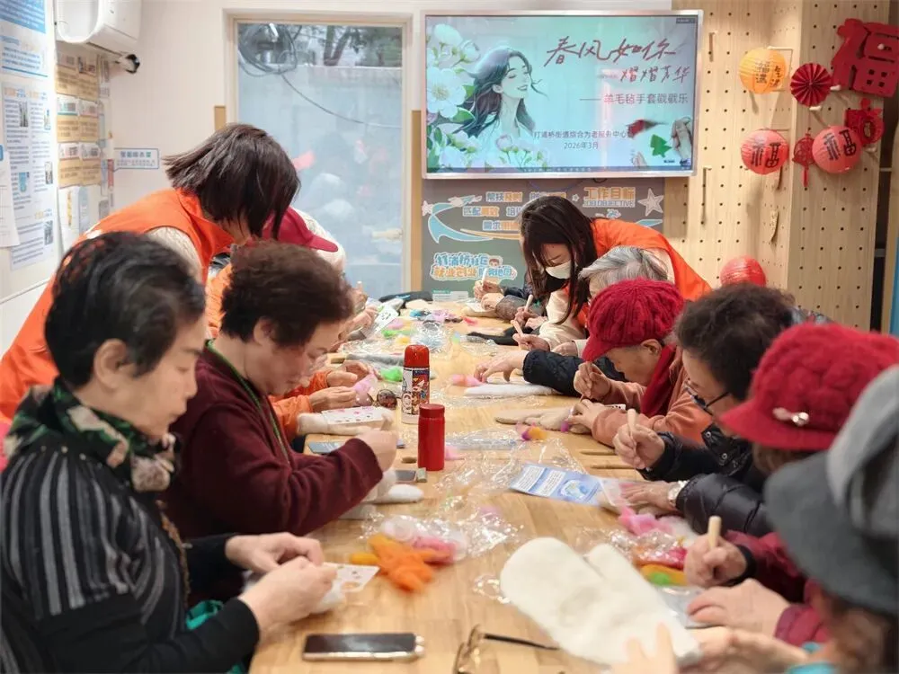 软fufu的羊毛在指尖慢慢成型,长者们一边聊着天一边戳出满手温暖,既锻炼了手部灵活度,又把女神月的仪式感和春日暖意,一针一线戳进了手套里,藏进了岁月里。