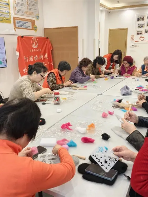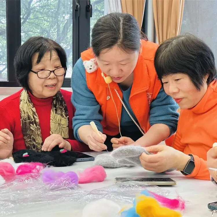 活动现场准备了色彩丰富的羊毛、专用戳针以及图案模版,工作人员充分考虑到长者们的动手节奏,放慢语速耐心讲解,从握针手法、羊毛铺陈到安全技巧都逐一示范。每场活动都吸引了不少长者积极参与,大家围坐在一起化身手工达人,选色、固定、戳制,动作从生疏慢慢变得熟练。
