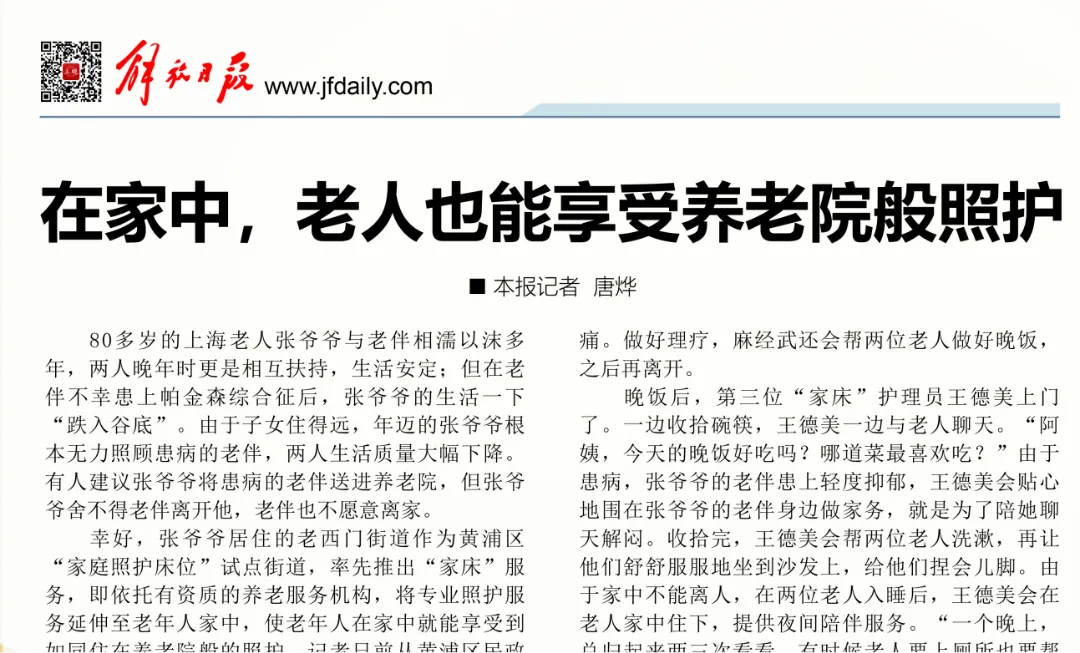 快乐颐亮相《解放日报》:一支团队服务一位老人,三名护理员一名护士围着老人转