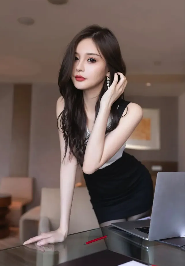 她俯身靠在桌边的那一瞬间,优雅中带着点小性感。长发披肩,红唇微启,珍珠耳环点缀,整个人散发着知性女神的魅力。这就是传说中的办公室女神吧?