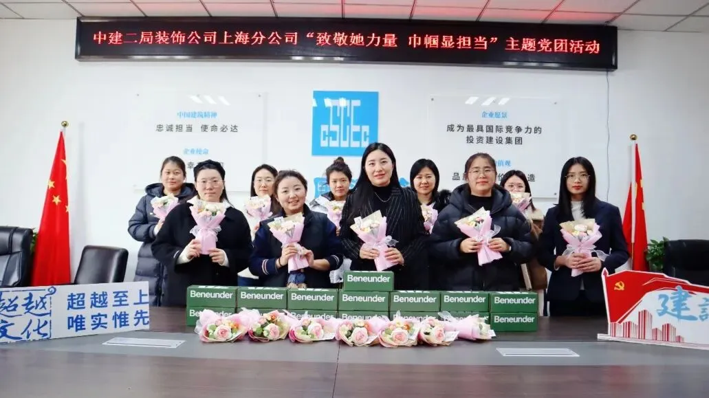 上海分公司组织开展“致敬她力量 巾帼显担当”妇女节系列活动,分公司机关、上饶阳光城项目为女性职工送鲜花,临港西岛项目、龙港市人民医院项目为女性职工发放慰问品,安吉财富中心项目为女性工友发放节日大礼包,南通大学项目开展春季采摘活动,以不同方式致敬“她”力量。