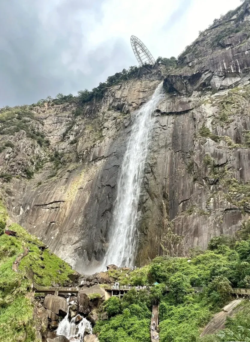 悬空高度314米,下面是深不见底的悬崖峭壁和奔腾而下的瀑布,是景区的网红打卡点和爱情圣地。