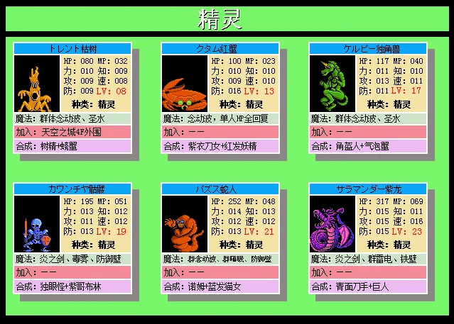 的仲魔,一共有62种。若仲魔属性相克,则会合成为树妖,这也