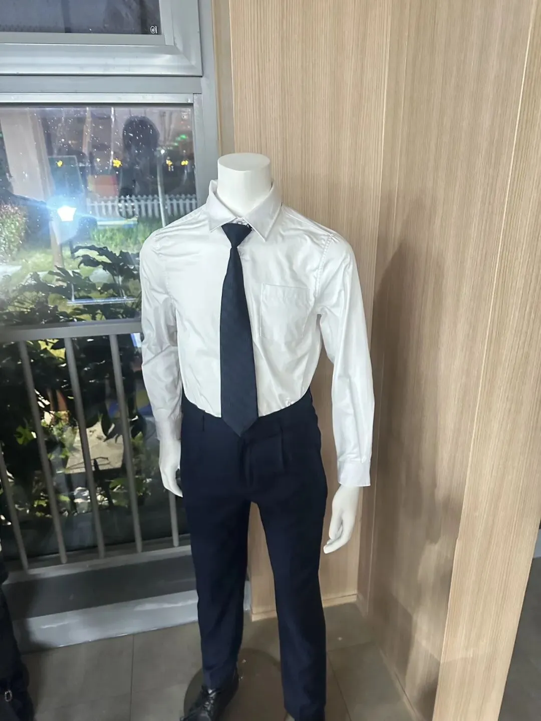 学校大厅有个模特穿着全套校服的展示区域。