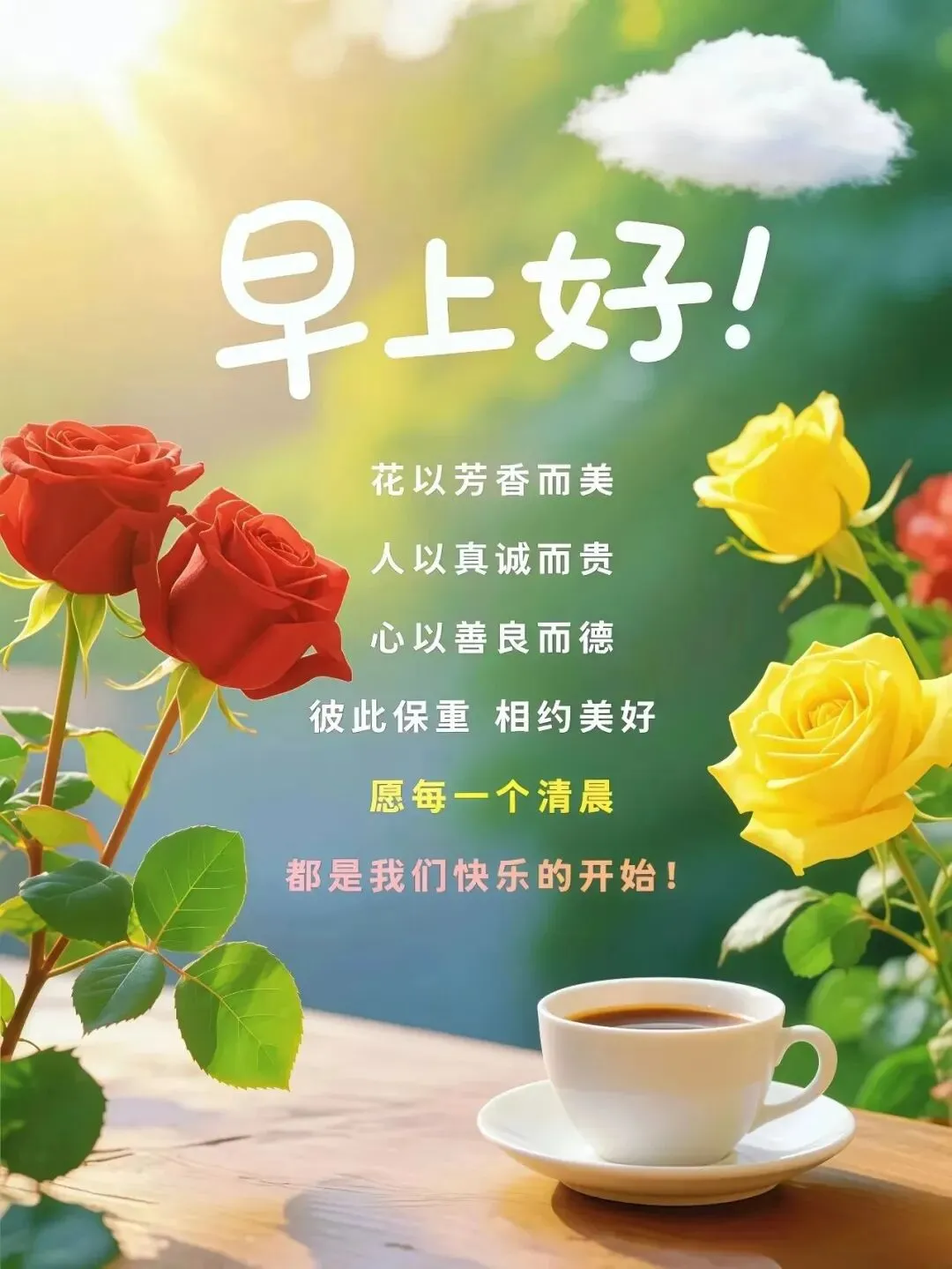 我把最好、最真诚的祝福献上,不是今天,而是每一天。愿我们一年四季,季季平安;12个月,月月健康;52周,周周精彩;365天,天天快乐!早上好!🌹🍎🌞❤️🤝🎉