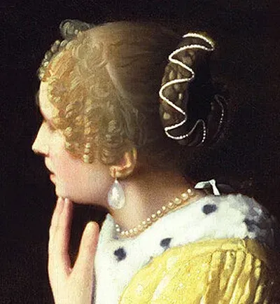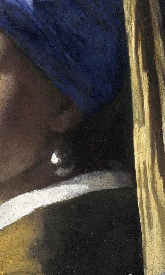 是少女左耳佩戴的一只泪滴形珍珠耳环