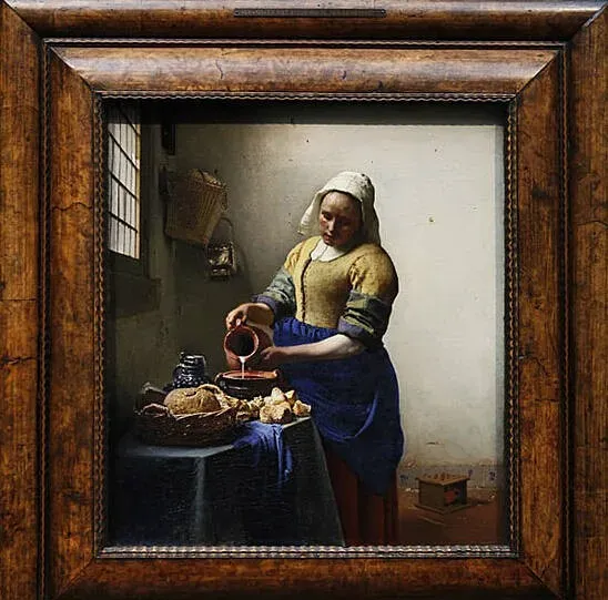 维米尔与同时代画家的不同之处在于,他以极端、甚至颤抖的感光度来表现光线,喜欢用蓝色和柠檬黄两种色彩组成十分和谐的色调。他的作品中特别的光感,实际上是借由一种新的技巧而达成的。