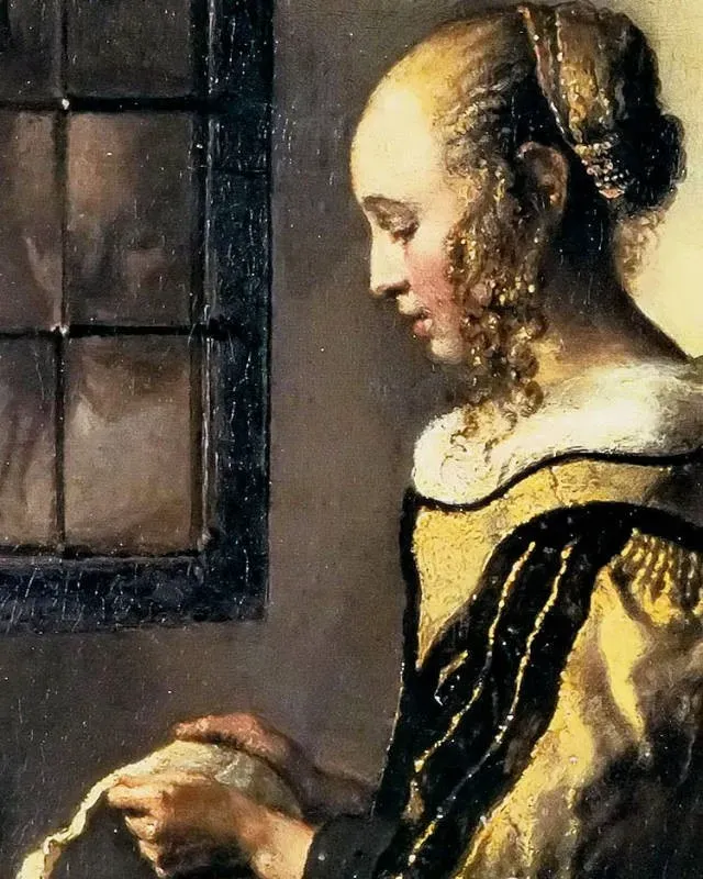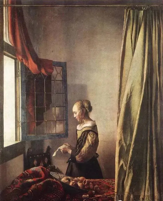 在这一幅画中,画家描绘了一位正临窗专心看信的女子,她神情专注、庄重大方,仿佛正在被信中的内容所吸引,她周围的一切都在沉静中消失而不复存在。
