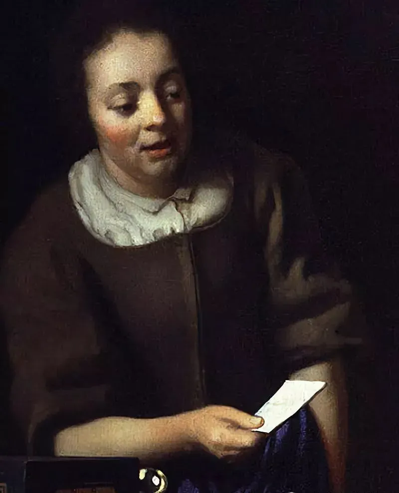 维米尔还曾画过另一幅立于室内光照下已有身孕的读信女子。除了环境陈设稍有变更外,人物动态形象大致相似。
