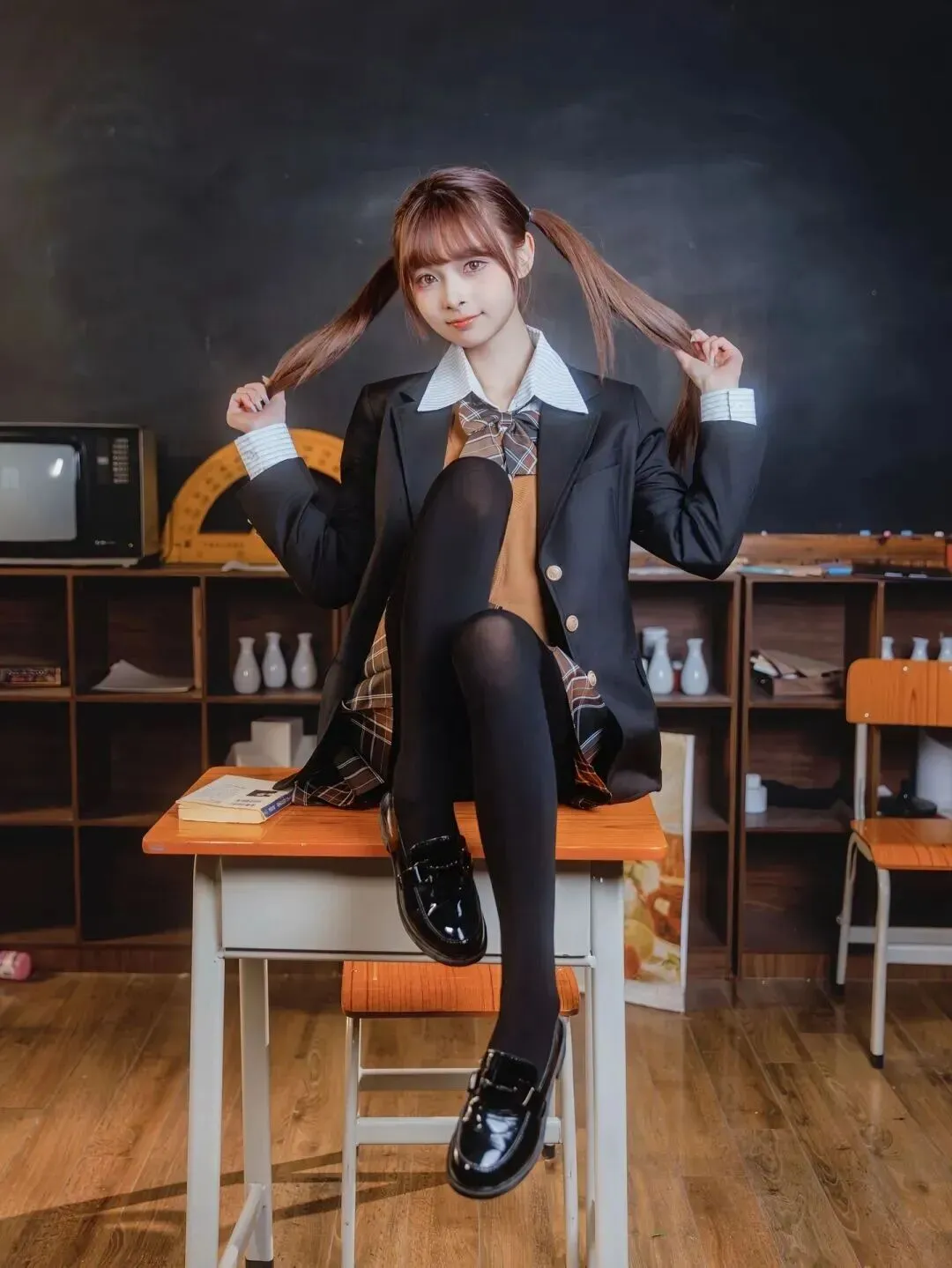 坐在课桌的桌面上,双手分别抓住左右两边的马尾轻轻拉一拉,脚自然搭在课桌上。黑板和旧电视当背景,整个人透着软乎乎的元气感,像课间和同学打闹的瞬间,特别有画面感!