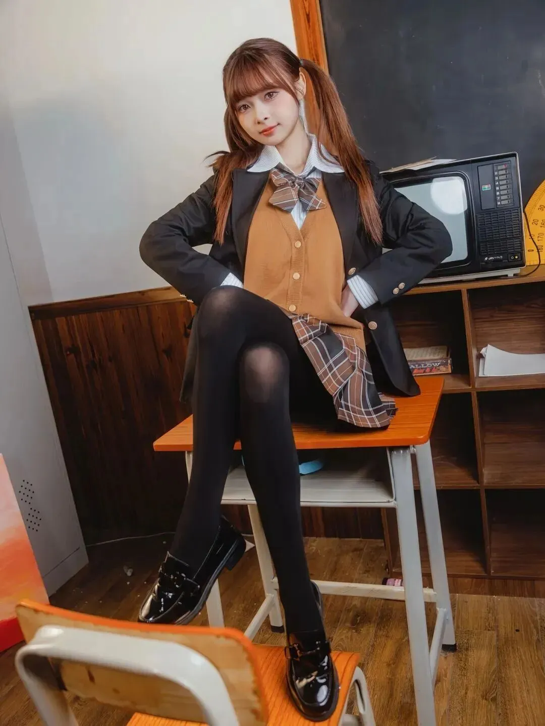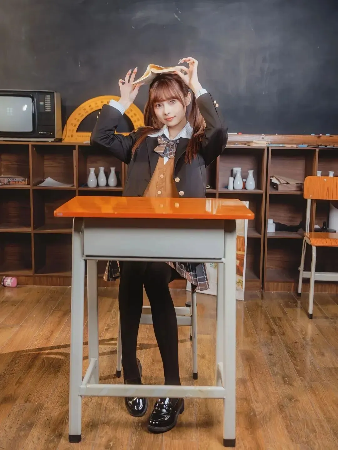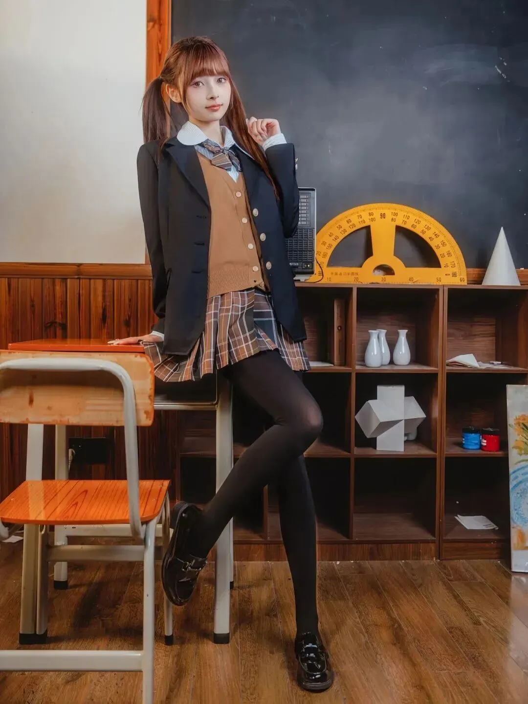 我跟你们说!教室拍 JK 真的太有青春那味儿了~ 就顺着这套黑西装 + 棕背心 + 格裙的学院感,让肢体跟着环境和光影自然舒展,不需要特意摆造型,随便拍拍都像从日剧里走出来的女高中生!你们有没有试过在课桌和黑板前拍照?超有氛围感的!