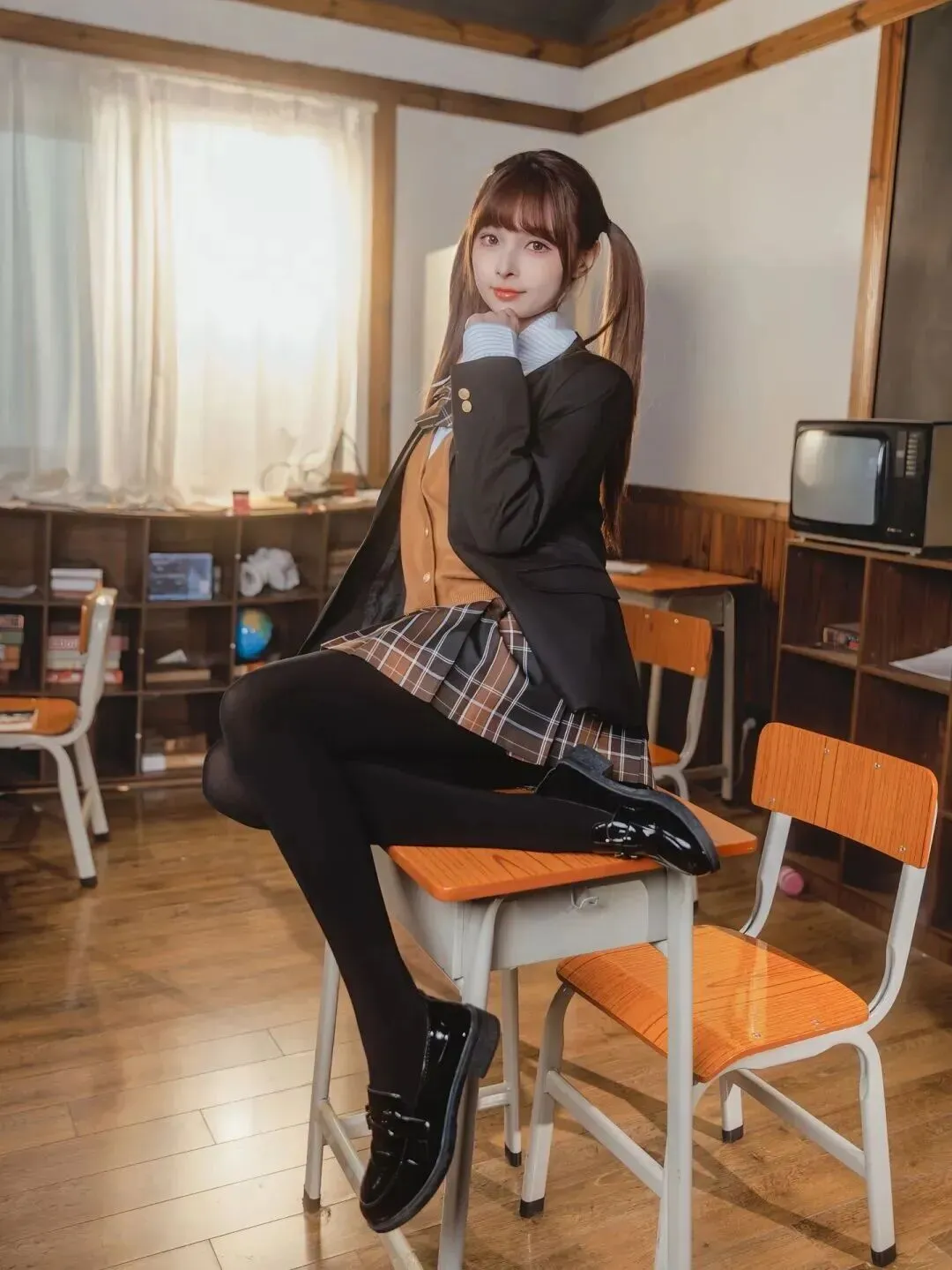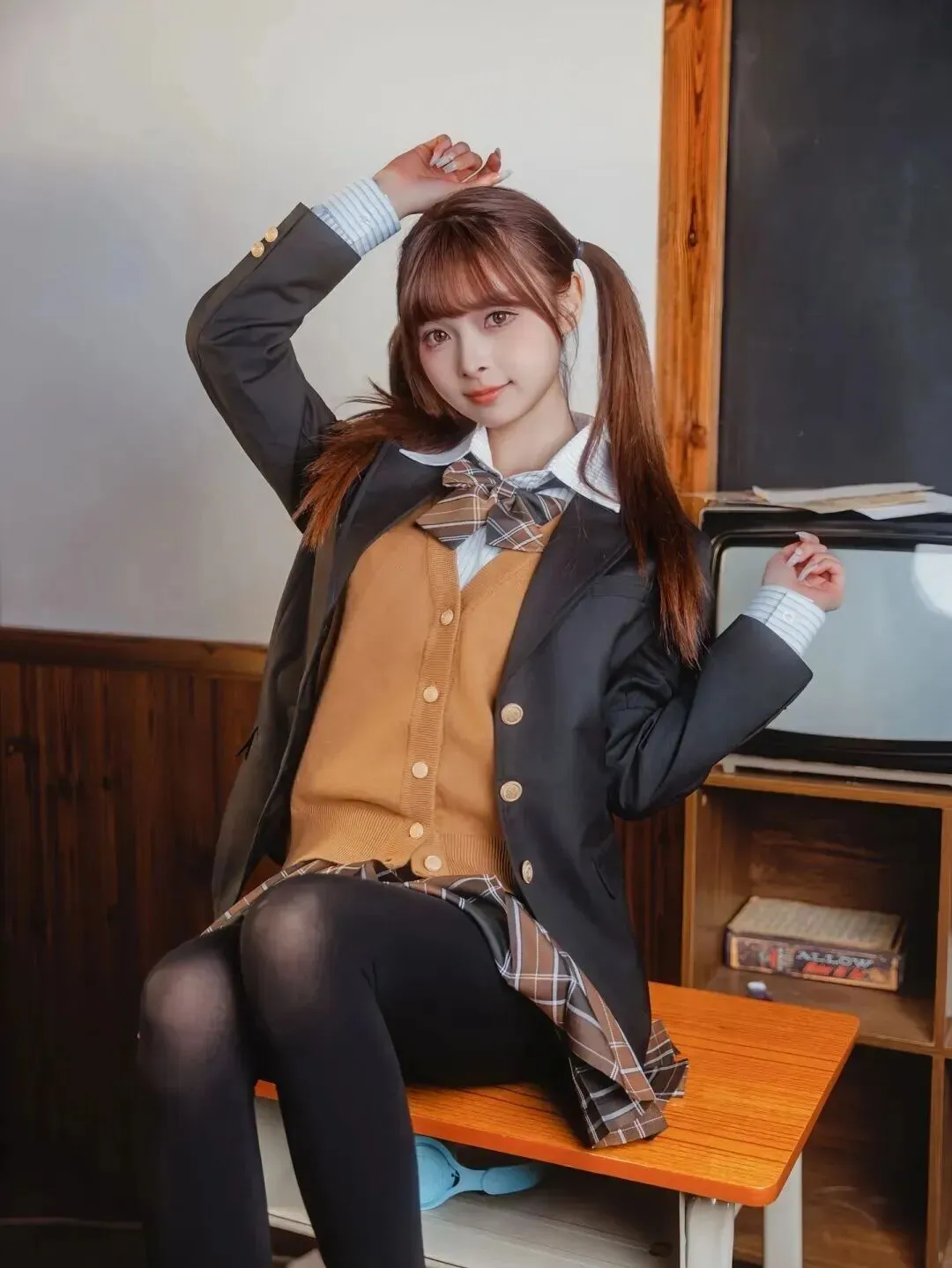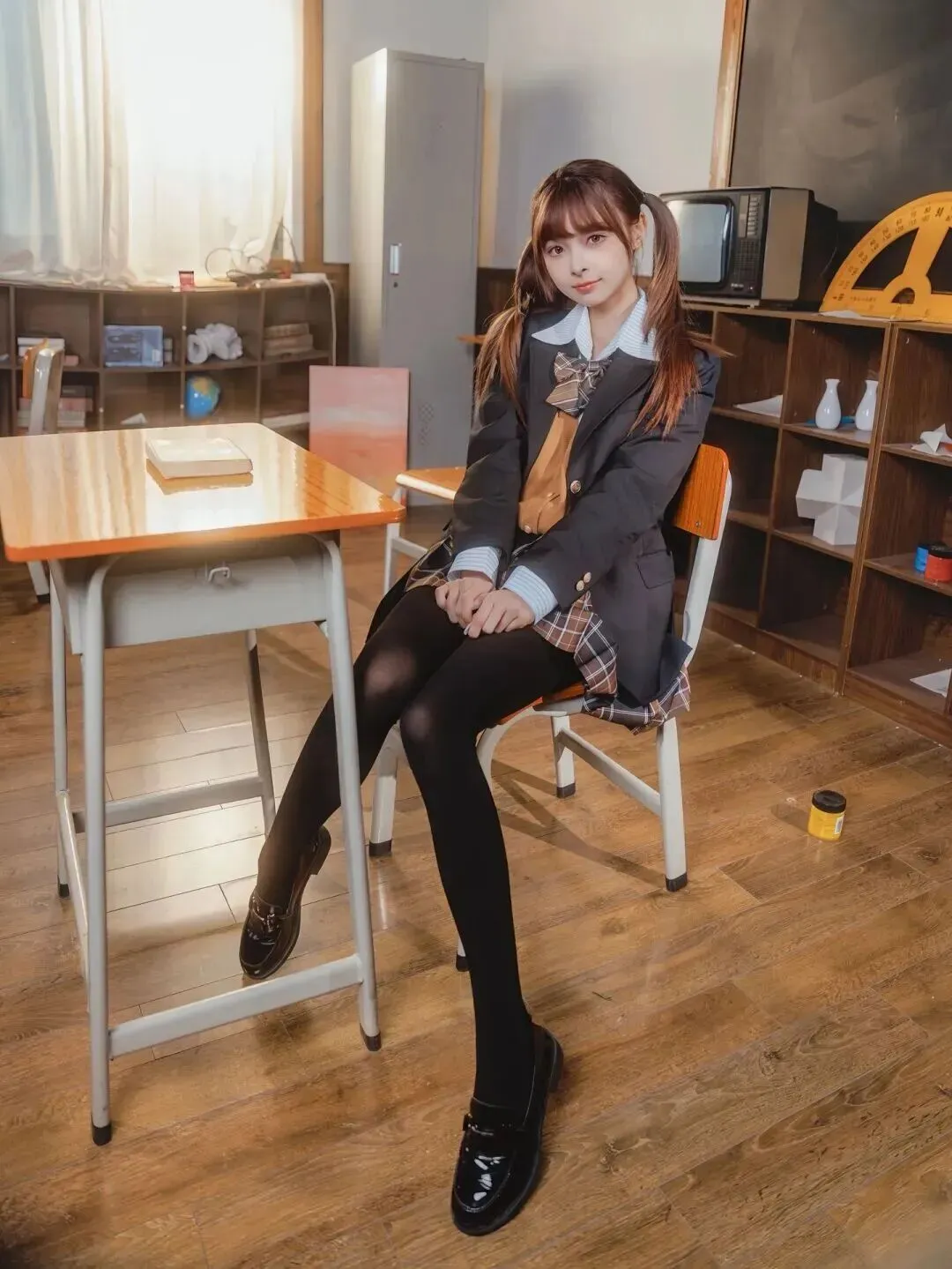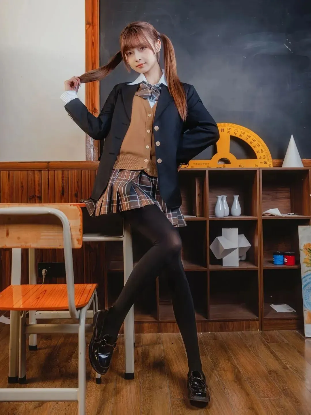 我跟你们说!教室拍 JK 真的太有青春那味儿了~ 就顺着这套黑西装 + 棕背心 + 格裙的学院感,让肢体跟着环境和光影自然舒展,不需要特意摆造型,随便拍拍都像从日剧里走出来的女高中生!你们有没有试过在课桌和黑板前拍照?超有氛围感的!