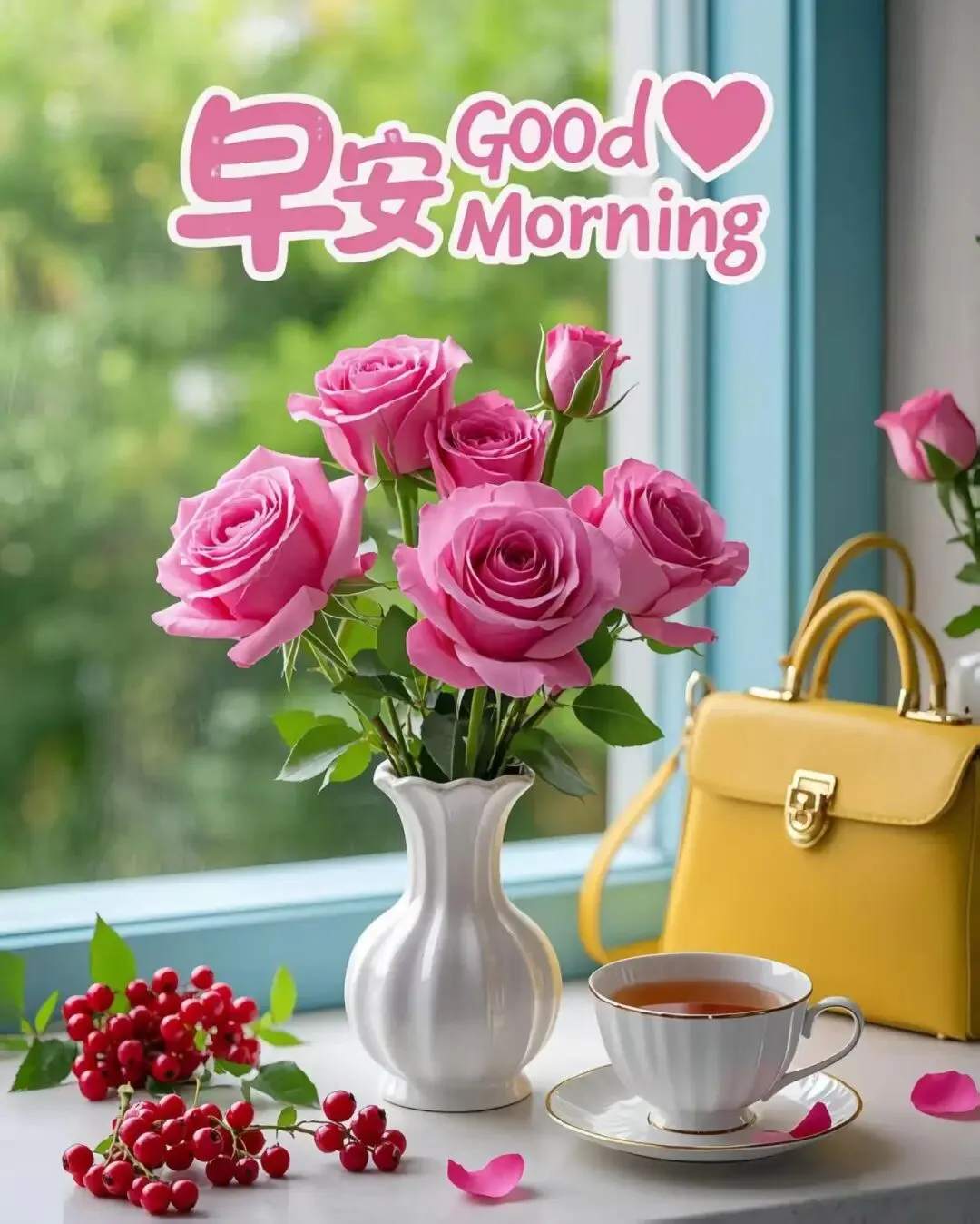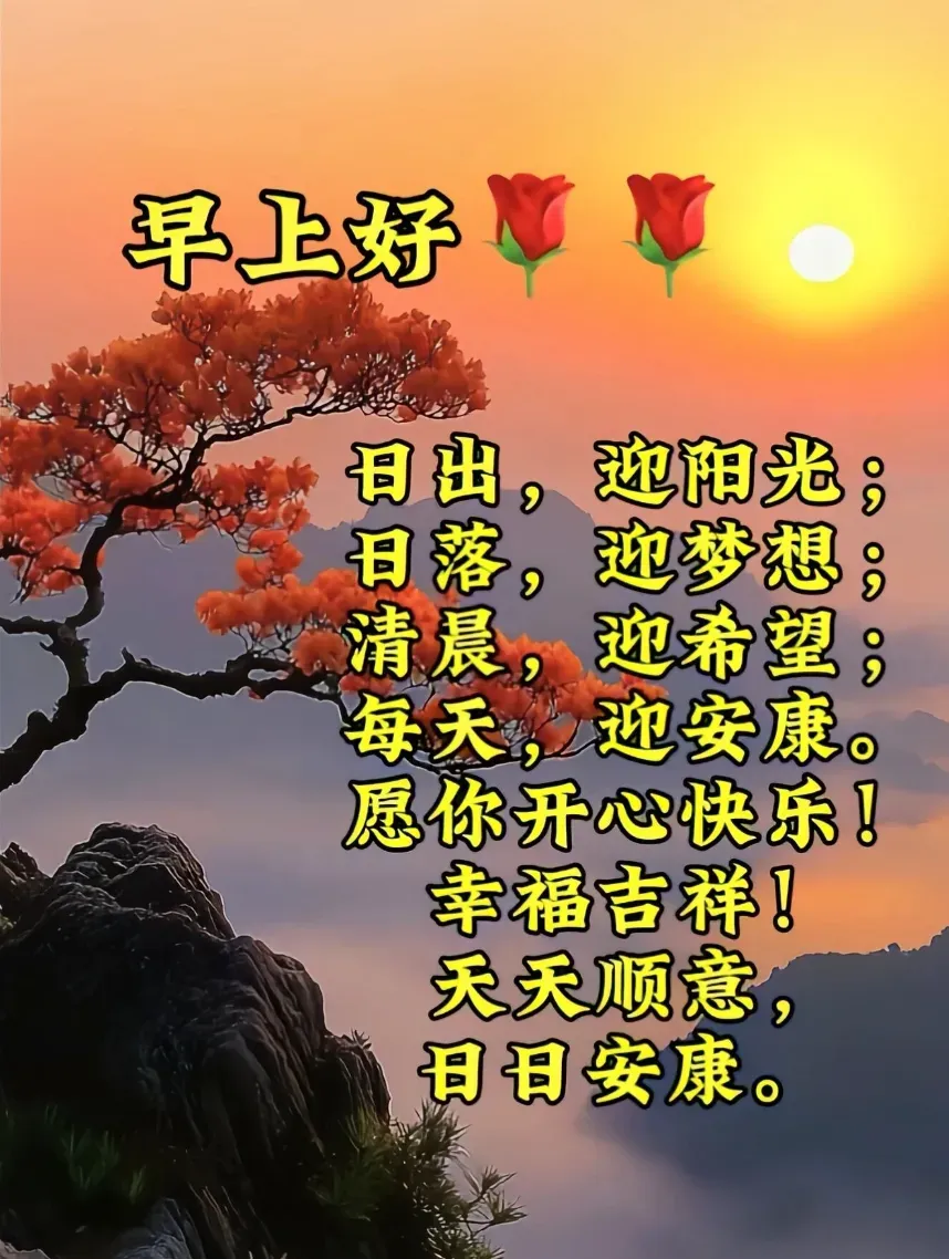 早起空气真叫好,伸个懒腰心情妙;喝杯温水润脾胃,开启活力每一秒;生活顺心不烦躁,幸福快乐没烦恼。早上好!🌹☀️🌺🙏😊🎉