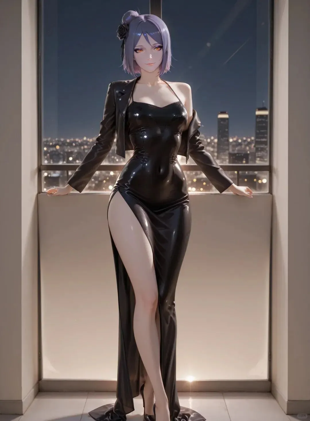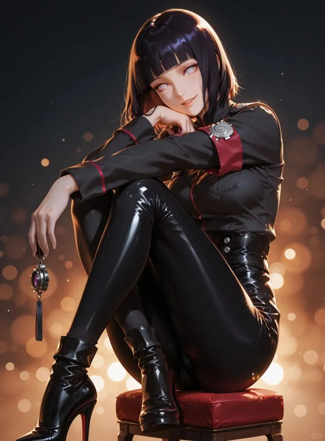 而纲手婆婆(哦不,是纲手姐姐!),金发低马尾,额间的菱形印记还是那么显眼,橄榄绿短款皮衣 + 黑色紧身皮裤,靠在霓虹灯下的墙壁上,指尖按在密码锁上,眼神又野又勾人。