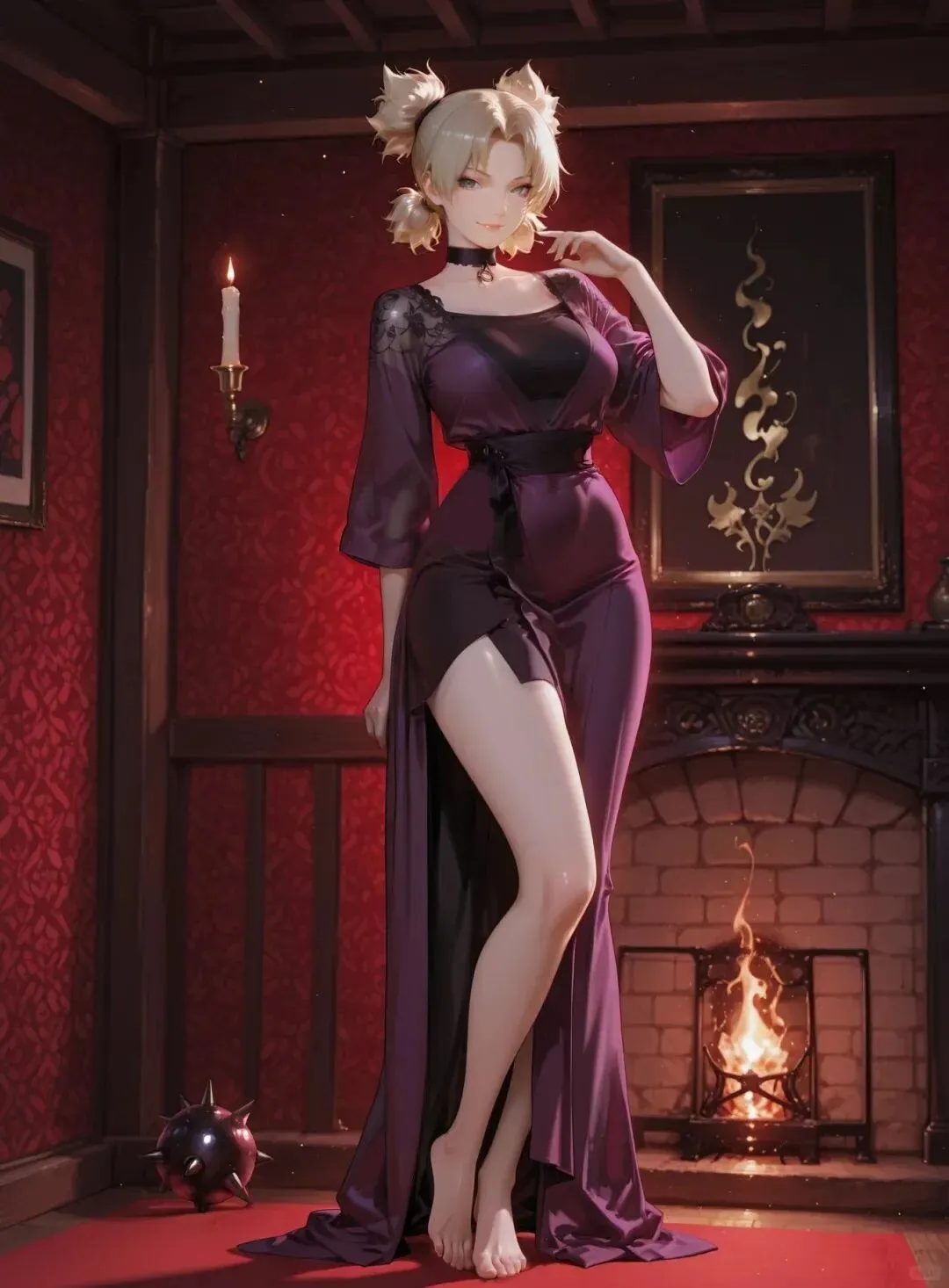 双马尾还是那么有辨识度,紫色丝绒睡裙 + 黑色蕾丝拼接,颈间的黑色 choker 又添了几分禁欲感,站在壁炉前,暖光打在她身上,连发丝都在发光。