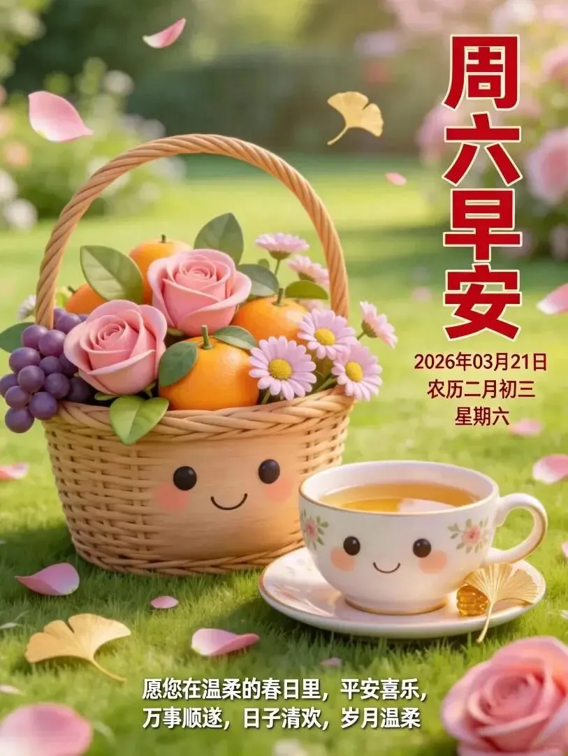 1. ☀️早安!今天是2026年3月21日,惬意的周六。不必赶时间,不用被工作追赶,好好享受慢下来的时光。放下疲惫,卸下压力,给自己一份轻松与心安。愿你被温柔包围,被好运照顾,日子清净安稳,周末舒心自在,平安喜乐常相伴。