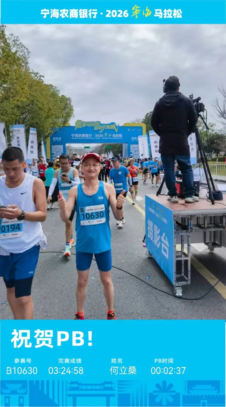 宁海,是徐霞客传奇的起点,也是我2026年赛道的起点。严寒封不住跑友们的热情。平坦弯少的赛道,是pb最硬核的助力。漂亮的奖牌,提前刻好名字的铭牌,都体现了主办方的用心。吕总裁亲临指导,更提升了比赛的专业度。宁海之行的快乐,还要感谢94级信息校友王荣辉的盛情款待。琳琅满目的各种时令海鲜,碗大如盆的海鲜面,将十几种美味统统囊括的汤包,朴素清香的麦饼,香喷喷沉甸甸的山粉馏,实在让人难以抗拒,一碗接一碗。周末约上三五好友去前童喝碗豆浆吃个大饼,长寿村边泡泡温泉,幸福感拉满。宁海真好,期待下次再见!(杨帆 12级MPCC)