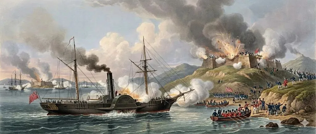 战斗打响后,斯科特上尉驾驶“萨马朗号”英勇领航。面对清军的火力,他沉住气一炮未发,直到船只在距离炮台中心仅200米的位置抛锚停稳。