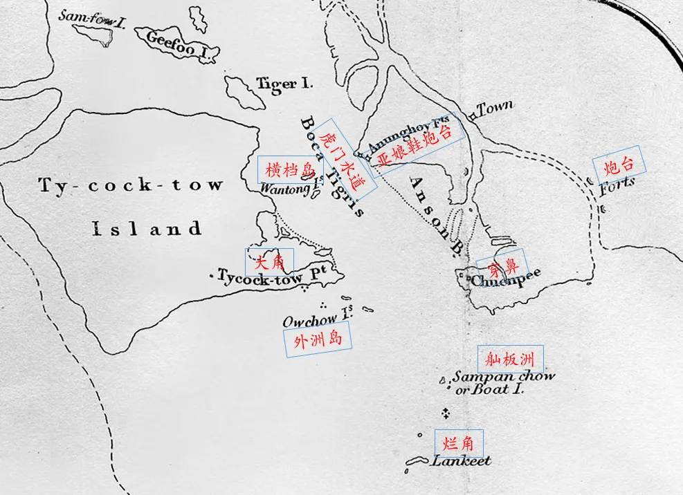 盒子君附图:穿鼻和大角扼守珠江进入广州的通道,形同左右大门,中间有横档岛也设炮台