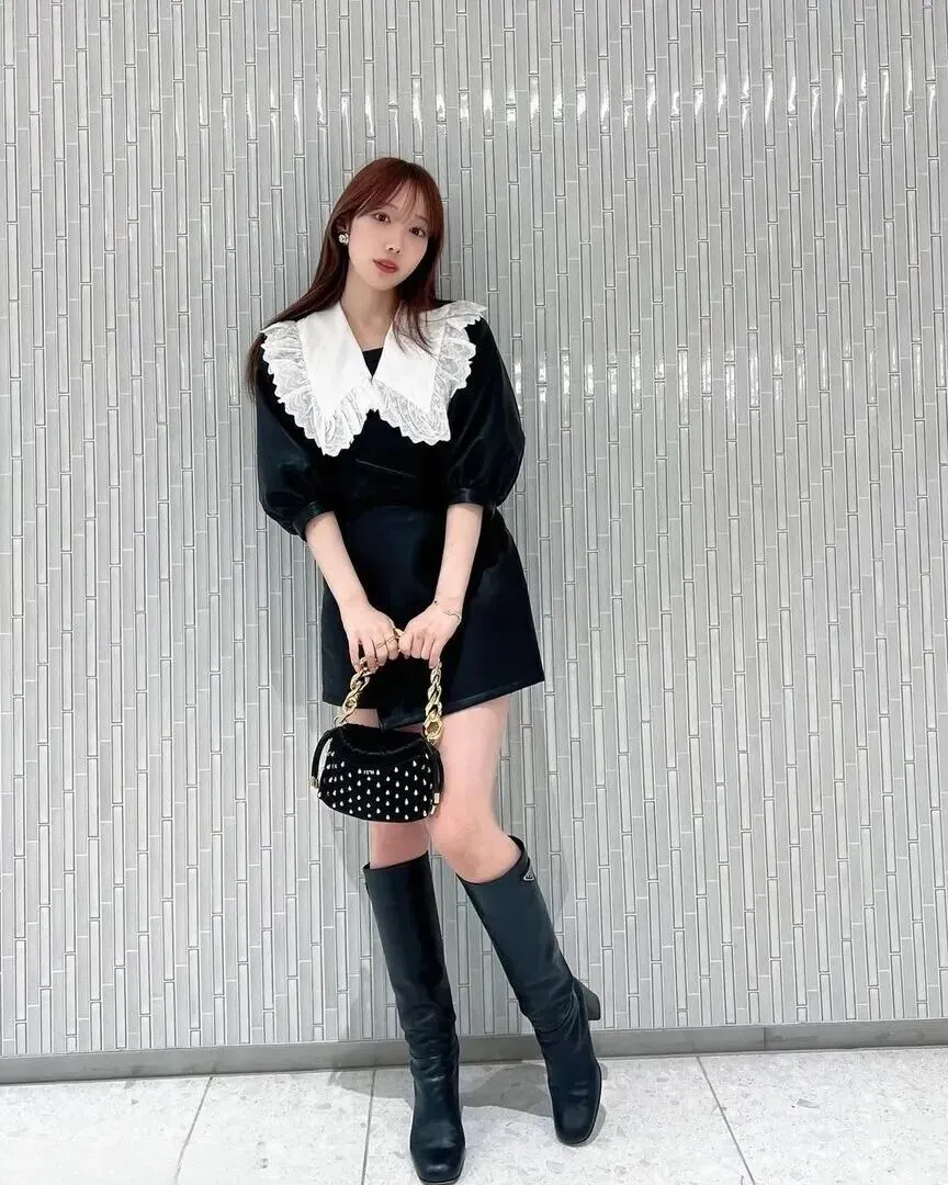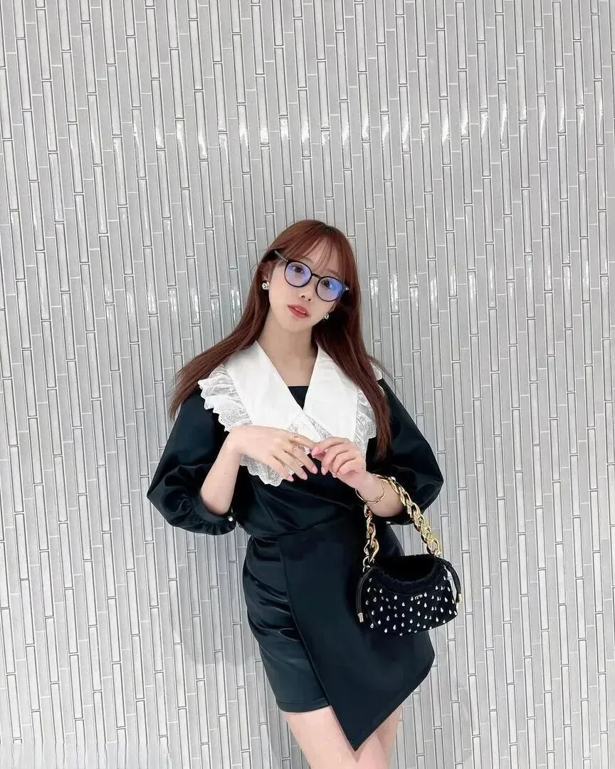 包包选的是黑色手提款,上面镶着白色的水滴装饰,远看像一串小珍珠。链条是粗粗的金属款,背起来特别有气场。它完美中和了裙子自带的甜度,让整体风格不会太腻。有时候一个小配件就能改变全身的感觉,这话一点没错。