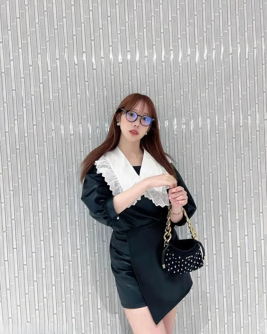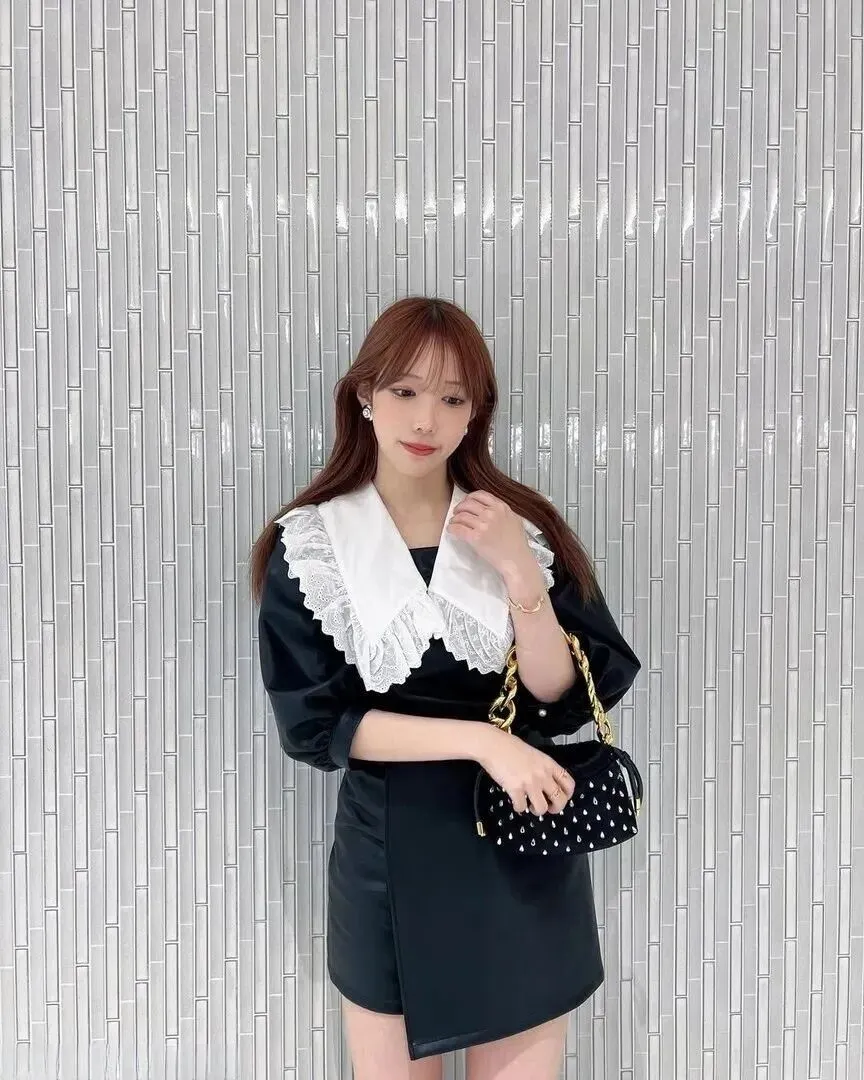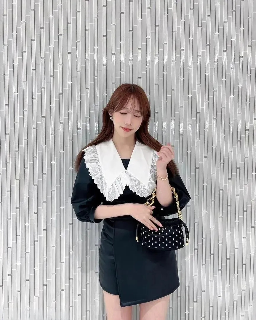 先说说第一眼的感觉。这条裙子的剪裁太到位了,整体是那种不拖泥带水的利落线条,但穿上身居然特别显曲线。最绝的是领口——一大片白色翻领配上细细的蕾丝边,一下子就把黑色的沉闷感打破了。蕾丝的花纹软软的,和裙子的皮质料子撞在一起,居然一点不违和,反而有种复古的温柔劲儿。袖子是宽松的中长款,藏肉效果一流,胳膊有点肉的姐妹也能放心穿。抬手的时候袖子微微晃动,莫名多了几分灵动。