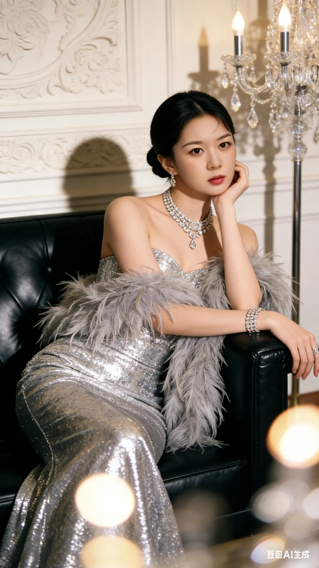 复古奢华风人像写真,东方女性慵懒坐于黑色皮质沙发,左臂搭扶手、右手托腮尽显高贵优雅。精致复古妆容配红唇深眼妆,低发髻发型利落。身着银色亮片抹胸鱼尾礼服,外搭同色羽毛披肩,满钻首饰点缀华贵。背景是米白浮雕墙与水晶烛台,前景光斑添梦幻。经典明暗布光,暖调复古滤镜,银、暖金、黑主色,中心构图聚焦人物,细节写实如高定时尚大片,尽显复古奢华的高级质感与人文温度。比例9:16