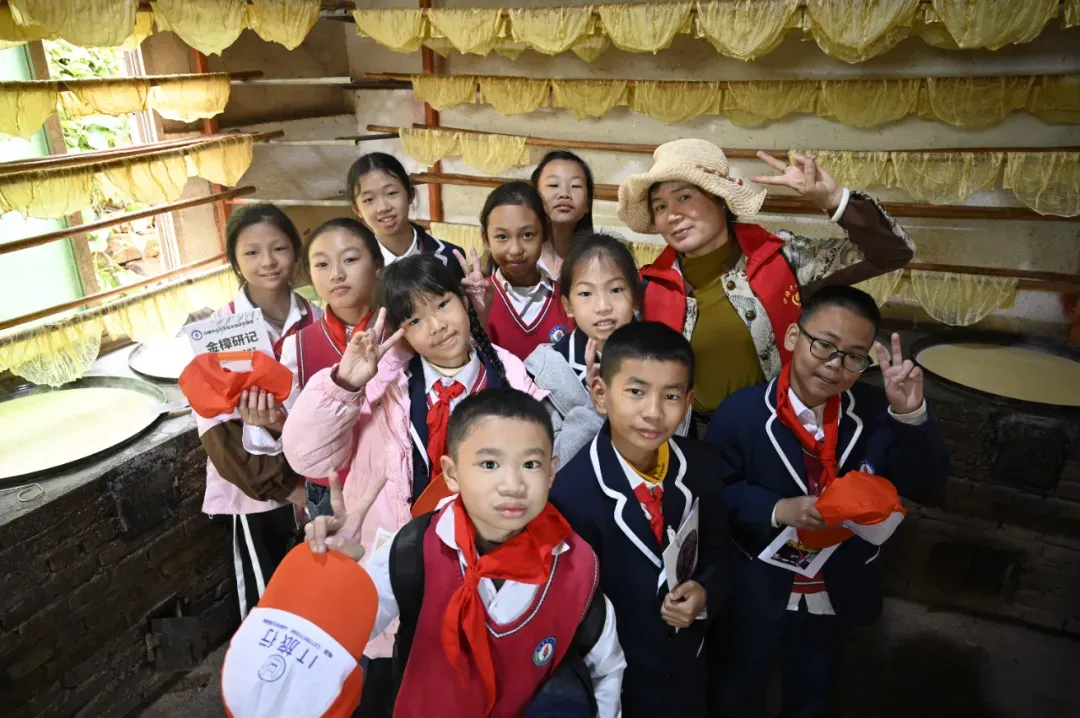 在樟脚村,有一门传自明清的老技艺——手工豆皮。风味独特的樟脚豆皮已成为当地一张美食名片。豆皮是大豆磨浆烧煮后,凝结晾干而成的豆制品。风味独特的樟脚豆皮是当地一张美食名片。穿过古居居,同学们来到手工豆皮作坊参观,了解豆皮的传统制作工艺。工坊未制作不能参观,则无此项目,费用不减)