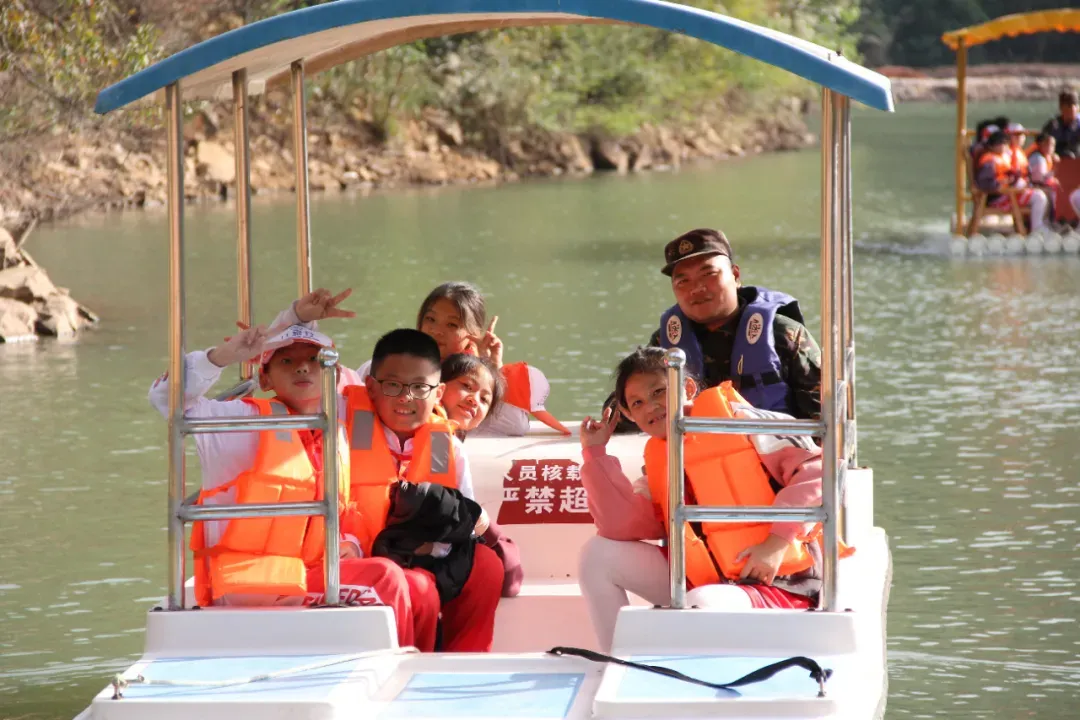 休闲一刻,同学们一起坐上船,置身青山绿水间,一边谈笑,一边欣赏美景,享受休闲时光。