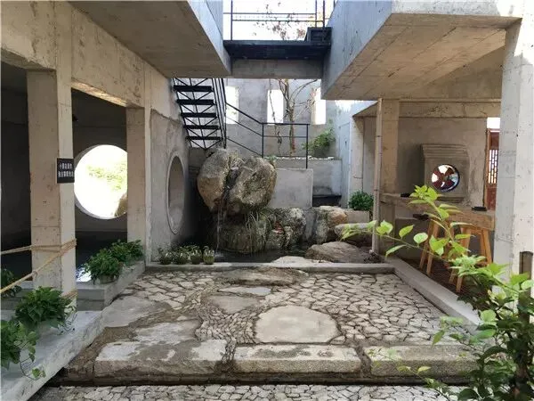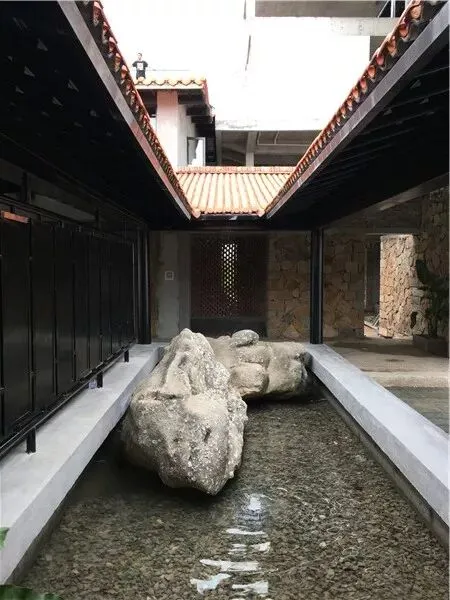 美术馆整体主要以钢结构为主,借鉴了闽南的石头房建筑风格。在门外就能看到乱石墙,由清水泥和民居拆下的废弃毛石砌筑,不规则的堆砌有一种随性的美感,白色的门牌用书法描绘着“小岞美术馆”五个大字,倒也很适合拍照打卡。
