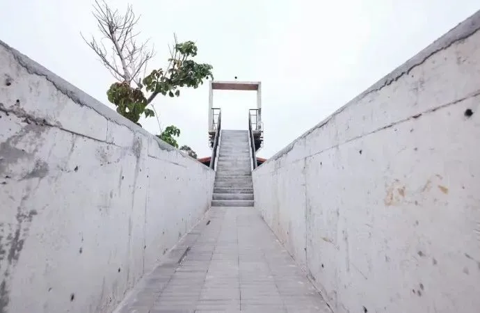 小岞美术馆由一座乡村制药车间改造而成。在地理位置上,临近海域,有水无山少树木。建筑师董豫赣最初尝试将其一百米长的屋脊,改造为一条通往大海的一条脊道。