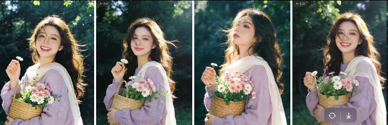 以参考图人物为原型,完全保留面部特征,生成xx张照片,人物动作取景角度丰富:半身、全身、脸部近景、脸部特写;日系富士胶片风的人像写真,冷色调;部分照片微光打在飘起的发丝上,部分发丝扬在脸上,人物表情丰富,开心大笑,浅笑或放空;3:4比例高清写真,画面中一位年轻女性身着浅紫色宽松针织毛衣,质地柔软亲肤,搭配米白色轻薄披肩随意搭在肩头,增添了慵懒温柔的气质。她留着自然微卷的深棕色长发,发丝蓬松且带着自然的毛躁感,部分发丝被微风轻拂,随意地散落在脸颊与肩头,无刻意造型的松弛感。妆容清透自然,底妆轻薄服帖,眼妆以大地色晕染出柔和轮廓,唇色是淡粉裸调,整体呈现出原生感的元气。她的左手抱着一只编织草编篮,篮中盛放着粉白相间的小雏菊与绿色枝叶,右手轻捏一朵小雏菊,神情放松又治愈。背景是茂密的深绿色树林,枝叶繁茂,阳光透过叶隙形成斑驳的光影,空气里仿佛带着草木的清新气息。光线是温暖的午后侧逆光,柔和地勾勒出发丝的金色轮廓,营造出日系清新治愈的氛围,整体风格自然松弛,充满春日的鲜活与温柔。