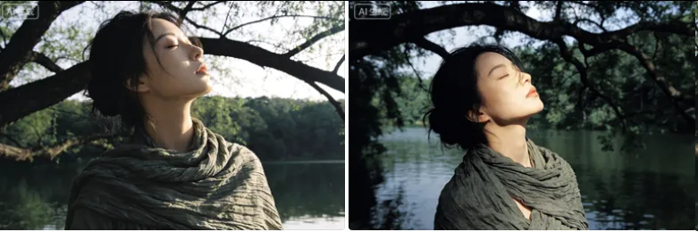 以参考图人物为原型,完全保留面部特征,帮我生成图片:生成xx张照片,用我给你的图片里的人物,五官不变,照片内容是清冷气质的东方年轻女性,发丝微乱挽起,身着灰绿色肌理感褶皱围巾/披肩;置身人间湖畔,背景是静谧的湖水,枝桠交错的古树与葱郁的树林,柔和的自然光透过枝叶形成斑驳光影,部分画面中阳光侧打在面部形成逆光轮廓;特写/半身人像切换,闭眼仰头/回头侧望的自然神态,电影感叙事镜头,低饱和莫兰迪色调,柔和的暗调光影,胶片颗粒质感,写实人像摄影,细节细腻,无AI生成痕迹,面部色彩真实自然无过度。原比例。