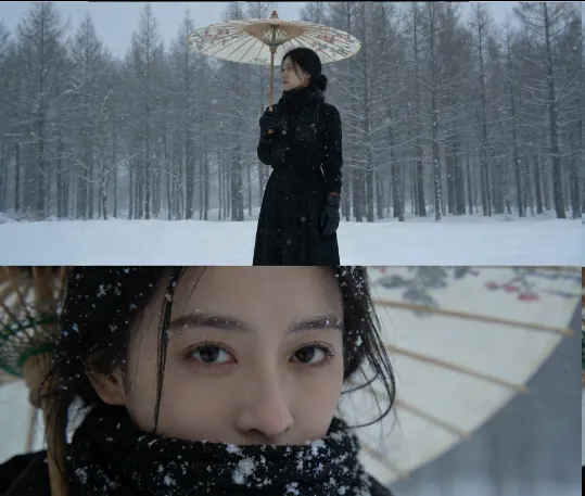 以图片人物为基础,生成xx张三拼图格式的冬日电影感叙事写真,每张图固定比例4:3,整体为清冷孤寂的冬日大雪场景,冷灰调,细腻雪花飘落,cinematic 质感。画面中有人物和参考图一致,上部第一张为近景,撑透中式花伞,黑色厚羽绒服+粗针织黑围巾,雪花点缀,眼神忧郁望右侧;中部第二张是人物是背景雪林,手持中式花伞,黑色长裙+黑手套,一个正面侧脸,画面空旷显孤寂;下部第三张是面部特写,面部与围巾细节,头发覆雪,围巾积雪清晰,眼神具故事感,中式花伞边缘若隐若现,光影柔和。三张图合成一个三宫格拼图。比例3:4。原比例。