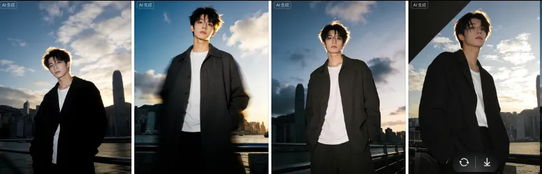 帮我生成图片:运用35定焦无畸变的镜头,打造出中景全身照的日常快照风格画面,具有CCD/iPhone实拍质感,呈现出非精心构图打光、生活感满满的场景。画面的主角是一位冷白皮的东方清冷人物,有着盐系禁欲风的独特气质。他的棱角分明的下颌线,底妆十分清透,皮肤白皙细腻,像冷玉一样干净、清爽且透着哑光质感,属于fair skin。他年轻冷峻,黑短发利落蓬松,额前碎发自然垂落,几缕发丝贴在饱满的额角。他神情清冷疏离,姿态自然松弛,摆出各种酷帅随性的pose,表情高冷又带点少年气,还散发着清冷校草气质和贵公子气场。他穿着慵懒的廓形外套搭配白色内搭,展现出冷峻飒爽的感觉。他身维多利亚港,背景是蓝天白云,暗调的环境静谧且层次丰富。在黄昏的柔和侧光照射下,光影斑驳,一半亮一半暗,对比柔和立体,发丝金边轮廓光非常明显。以仰拍的镜头呈现,他正脸看向镜头,整体氛围情绪饱满,视角独特,慢快门带来的朦胧美学和动态模糊,突出了画面的真实感与故事性,日常中又充满了氛围感。生成xx张,表情动作自然。比例:3:4。