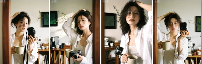 以参考图人物为原型,完全保留面部特征,生成xx张3:4比例的室内胶片人像:深棕/黑色头发,自然蓬松略凌乱,几缕发丝掠过眼睛与脸颊。身着白色宽松衬衫(领口微敞),内搭浅色背心/吊带,佩戴细金项链。手持徕卡相机(呈现自拍感)或手持燕麦色陶瓷咖啡杯。情绪慵懒、微醺、眼神放空,嘴唇微张,不刻意微笑;胸口以上近景,动作包括看镜头、单手抓头发,以及各种神态自然的抓拍瞬间;暖奶油色调偏黄,低对比,黑位抬起,轻雾感柔焦,浅景深背景虚化,胶片颗粒明显但细腻,轻微褪色,轻暗角,轻微高光泛光/晕影(halation),发丝带有轻微运动模糊;浅色墙面,室内自然光,画面前景有小面积虚化遮挡(如胡桃木门框),背景虚化处可见实木书架(内有书籍),书架桌面摆放咖啡机、各式杯子、实木抽纸盒,墙上挂有黑色实木框墨绿色画与绿枝;现场感、既视感、伦勃朗光、光影对比、氛围感、故事感;使用Otus 85mm F1.4 ZF.2 ASPH镜头质感,ins风,文艺构图,细节丰富,低饱和度,静谧氛围,35mm胶片颗粒,Kodak Vision3 500T美学,超写实,零修图瑕疵真人质感,自然光优先,真实阴影,环境光完全影响肤色。